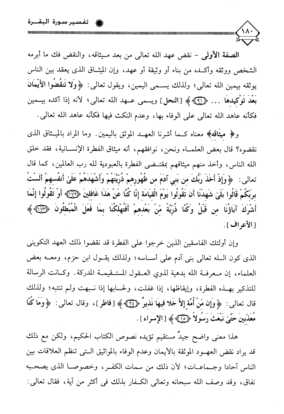 الصفة الأولى - نقض عهد الله تعالى من بعد ميثاقه، والنقض فك ما أبرمه الشخص ووثقه وأكده من بناء أو وثيقة أو عهد، وإن الميثاق الذي يعقد بين الناس يوثقه بيمين الله تعالى، ولذلك يسمى اليمين، ويقول تعالى: (وَلا تَنقُضُوا الأَيْمَانَ بَعْدَ تَوْكِيدِهَا. . .)، ويسمى عهد الله تعالى، لأنه إذا أكده بيمين فكأنه عاهد الله تعالى على الوفاء بها، وعدم النكث فيها فكأنه عاهد الله تعالى.