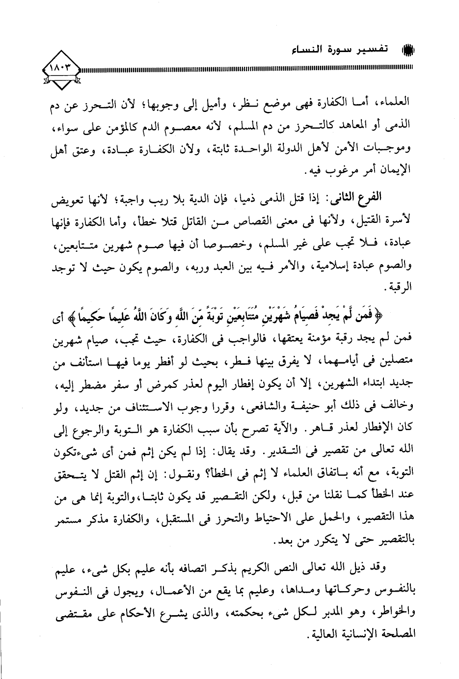 (فَمَن لَّمْ يَجِدْ فَصِيَامُ شَهْرَيْنِ مُتَتَابِعَيْنِ تَوْبَةً مِّنَ اللَّهِ وَكَانَ اللَّهُ عَلِيمًا حَكِيمًا) أي فمن لم يجد رقبة مؤمنة يعتقها، فالواجب في الكفارة، حيث تجب، صيام شهرين متصلين في أيامهما، لَا يفرق بينها فطر، بحيث لو أفطر يوما فيها استأنف من جديد ابتداء الشهرين، إلا أن يكون إفطار اليوم لعذر كمرض أو سفر مضطر إليه، وخالف في ذلك أبو حنيفة والشافعي، وقررا وجوب الاستئناف من جديد، ولو كان الإفطار لعذر قاهر. والآية تصرح بأن سبب الكفارة هو التوبة والرجوع إلى الله تعالى من تقصير في التقدير. وقد يقال: إذا لم يكن إثم فمن أي شيء تكون التوبة، مع أنه باتفاق العلماء لَا إثم في الخطأ؛ ونقول: إن إثم القتل لَا يتحقق عند الخطأ كما نقلنا من قبل، ولكن التقصير قد يكون ثابتا، والتوبة إنما هي من هذا التقصير، والحمل على الاحتياط والتحرز في المستقبل، والكفارة مذكر مستمر بالتقصير حتى لَا يتكرر من بعد.