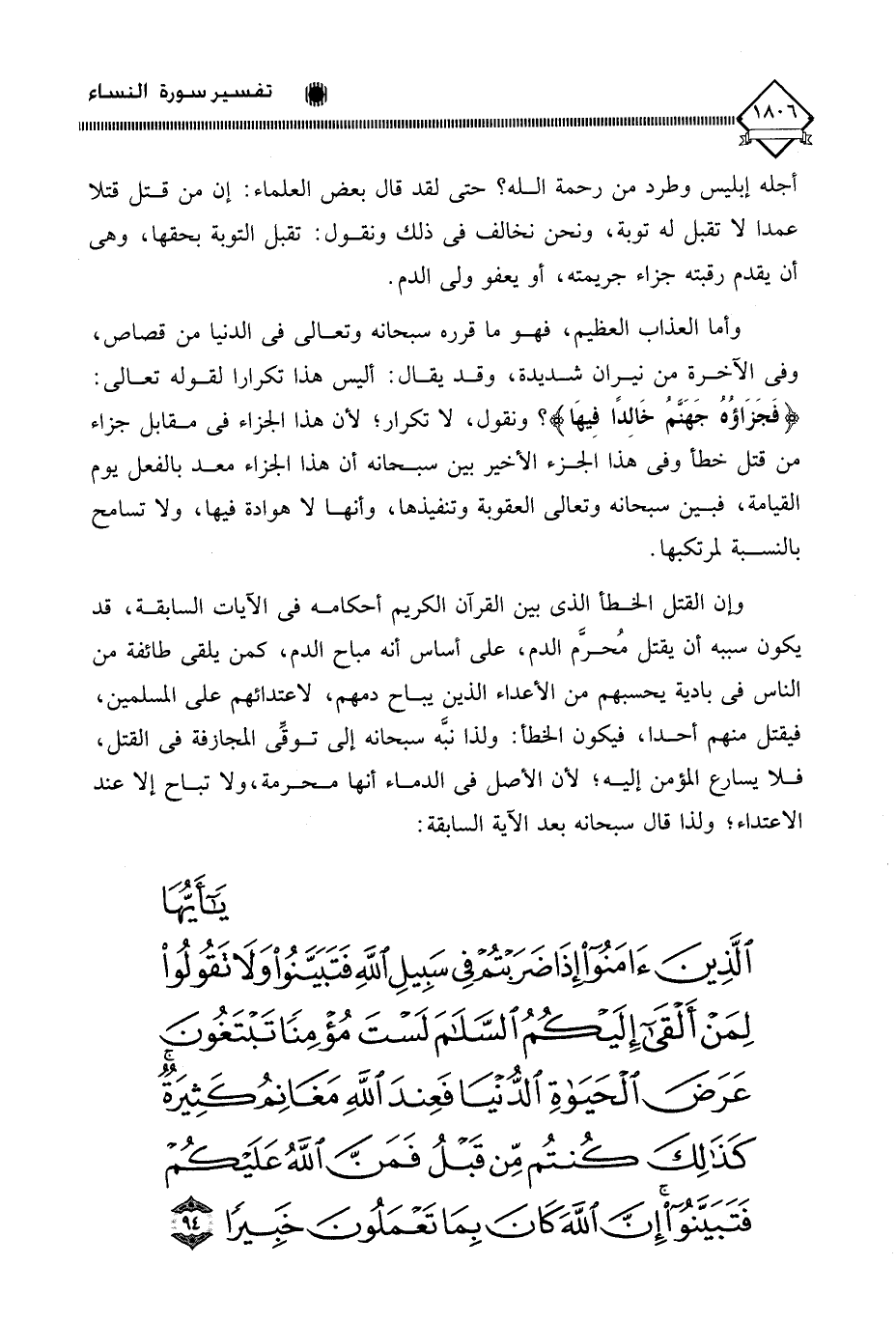 (يَا أَيُّهَا الَّذِينَ آمَنُوا إِذَا ضَرَبْتُمْ فِي سَبِيلِ اللَّهِ فَتَبَيَّنُوا وَلَا تَقُولُوا لِمَنْ أَلْقَى إِلَيْكُمُ السَّلَامَ لَسْتَ مُؤْمِنًا تَبْتَغُونَ عَرَضَ الْحَيَاةِ الدُّنْيَا فَعِنْدَ اللَّهِ مَغَانِمُ كَثِيرَةٌ كَذَلِكَ كُنْتُمْ مِنْ قَبْلُ فَمَنَّ اللَّهُ عَلَيْكُمْ فَتَبَيَّنُوا إِنَّ اللَّهَ كَانَ بِمَا تَعْمَلُونَ خَبِيرًا (94)