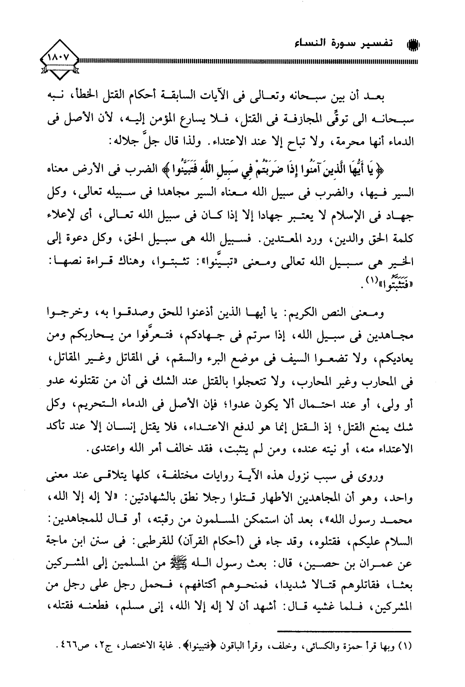 بعد أن بين سبحانه وتعالى في الآيات السابقة أحكام القتل الخطأ، نبه سبحانه إلى توقِّي المجازفة في القتل، فلا يسارع المؤمن إليه، لأن الأصل في الدماء أنها محرمة، ولا تباح إلا عند الاعتداء. ولذا قال جل جلاله: (يَا أَيُّهَا الَّذِينَ آمَنُوا إِذَا ضَرَبْتم فِي سَبِيلِ اللَّهِ فَتَبَيَّنوا) الضرب في الأرض معناه السير فيها، والضرب في سبيل الله معناه السير مجاهدا في سبيله تعالى، وكل جهاد في الإسلام لَا يعتبر جهادا إلا إذا كان في سبيل الله تعالى، أي لإعلاء كلمة الحق والدين، ورد المعتدين. فسبيل الله هي سبيل الحق، وكل دعوة إلى الخير هي سبيل الله تعالى ومعنى " تبينوا ": تثبتوا، وهناك قراءة نصها: " فَتَثَبَّتوا " (¬1).