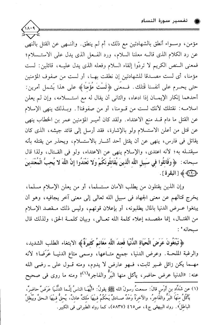 مؤمن، وسواء أنطق بالشهادتين مع ذلك، أم لم ينطق. والنهي عن قتل بالنهى عن رد الكلام الذي قاله معلنا السلام،؛ ورد الفعل الذي يدل الاستسلام، فمعنى النص الكريم لَا تردوا إلقاء السلام وفعله الذي يدل عليه، قائلين: لست مؤمنا، أي لست مصدقا للشهادتين. إن نطقت بها، أو لست من صقوف المؤمنين حتي يحرم أنفسنا قَتلك. فمعنى (لَسْتَ مُؤْمِنًا) على هذا يشمل أمرين: أحدهما إنكار الإيمان إذا ادعاه، والثاني أن يقال له مع استسلامه، وإن لم يعلن إسلامه: نقتلك لأنك لست من قومنا، أو من صفوفنا!. وبذلك ينهى الإسلام عن القتل ما دام قد منع الاعتداء. ولقد كان أمير المؤمنين عمر بن الخطاب ينهى عن قتل من أعلن الاستسلام ولو بالإشارة، فقد أرسل إلى قائد جيشه الذي كان يفاتل في فارس، ينهى عن أن يقتل أحد أشار بالاستسلام، ويحذر من يقتله بأنه سيقتله به؛ لأنه اعتدى، والإسلام ينهى عن الاعتداء، ولو في القتال، ولذا قال سبحانه: (وَقَاتِلُوا فِي سَبِيلِ اللَّهِ الَّذِينَ يُقَاتِلُونَكُمْ وَلَا تَعْتَدُوا إِنَّ اللَّهَ لَا يُحِبُّ الْمُعْتَدِينَ (190).