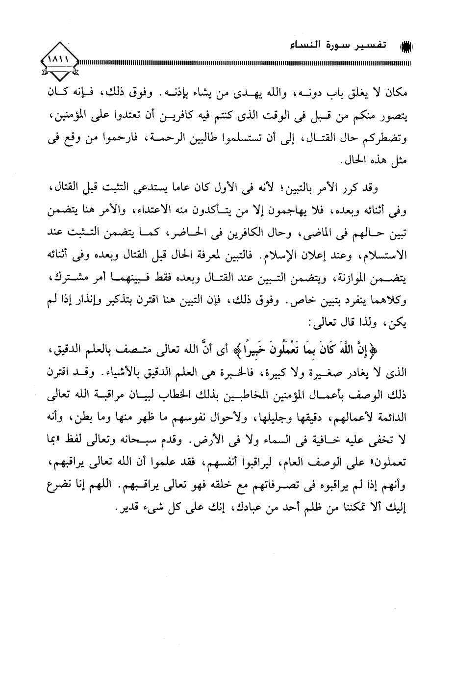 (إِنَّ اللَّهَ كانَ بِمَا تَعْمَلُونَ خَبِيرًا) أي أنَّ الله تعالى متصف بالعلم الدقيق، الذي لَا يغادر صغيرة ولا كبيرة، فالخبرة هي العلم الدقيق بالأشياء. وقد اقترن ذلك الوصف بأعمال المؤمنين المخاطبين بذلك الخطاب لبيان مراقبة الله تعالى الدائمة لأعمالهم، دقيقها وجليلها، ولأحوال نفوسهم ما ظهر منها وما بطن، وأنه لا تخفى عليه خافية في السماء ولا في الأرض. وقدم سبحانه وتعالى لفظ " بما تعملون " على الوصف العام، ليراقبوا أنفسهم، فقد علموا أن الله تعالى يراقبهم، وأنهم إذا لم يراقبوه في تصرفاتهم مع خلقه فهو تعالى يراقبهم. اللهم إنا نضرع إليك ألا تمكننا من ظلم أحد من عبادك، إنك على كل شيء قدير.