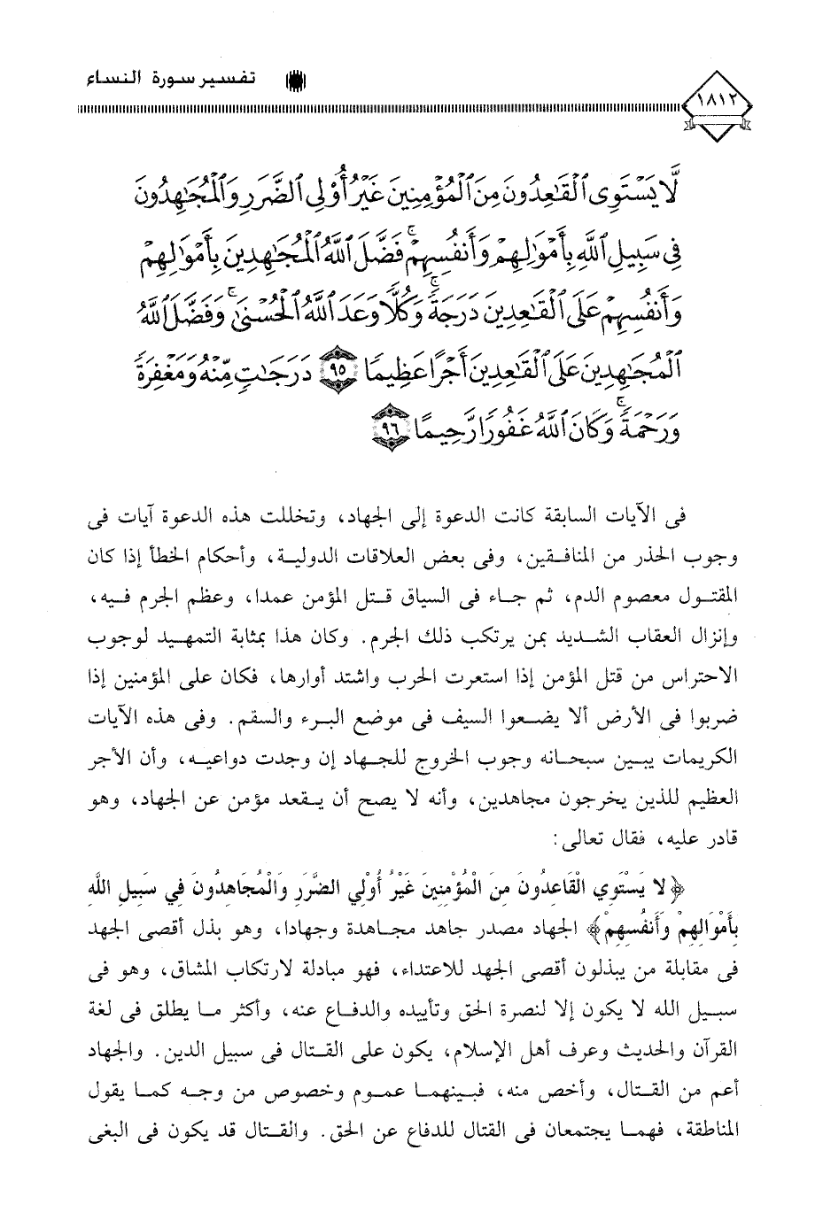 (لَا يَسْتَوِي الْقَاعِدُونَ مِنَ الْمُؤْمِنِينَ غَيْرُ أُولِي الضَّرَرِ وَالْمُجَاهِدُونَ فِي سَبِيلِ اللَّهِ بِأَمْوَالِهِمْ وَأَنْفُسِهِمْ فَضَّلَ اللَّهُ الْمُجَاهِدِينَ بِأَمْوَالِهِمْ وَأَنْفُسِهِمْ عَلَى الْقَاعِدِينَ دَرَجَةً وَكُلًّا وَعَدَ اللَّهُ الْحُسْنَى وَفَضَّلَ اللَّهُ الْمُجَاهِدِينَ عَلَى الْقَاعِدِينَ أَجْرًا عَظِيمًا (95) دَرَجَاتٍ مِنْهُ وَمَغْفِرَةً وَرَحْمَةً وَكَانَ اللَّهُ غَفُورًا رَحِيمًا (96)