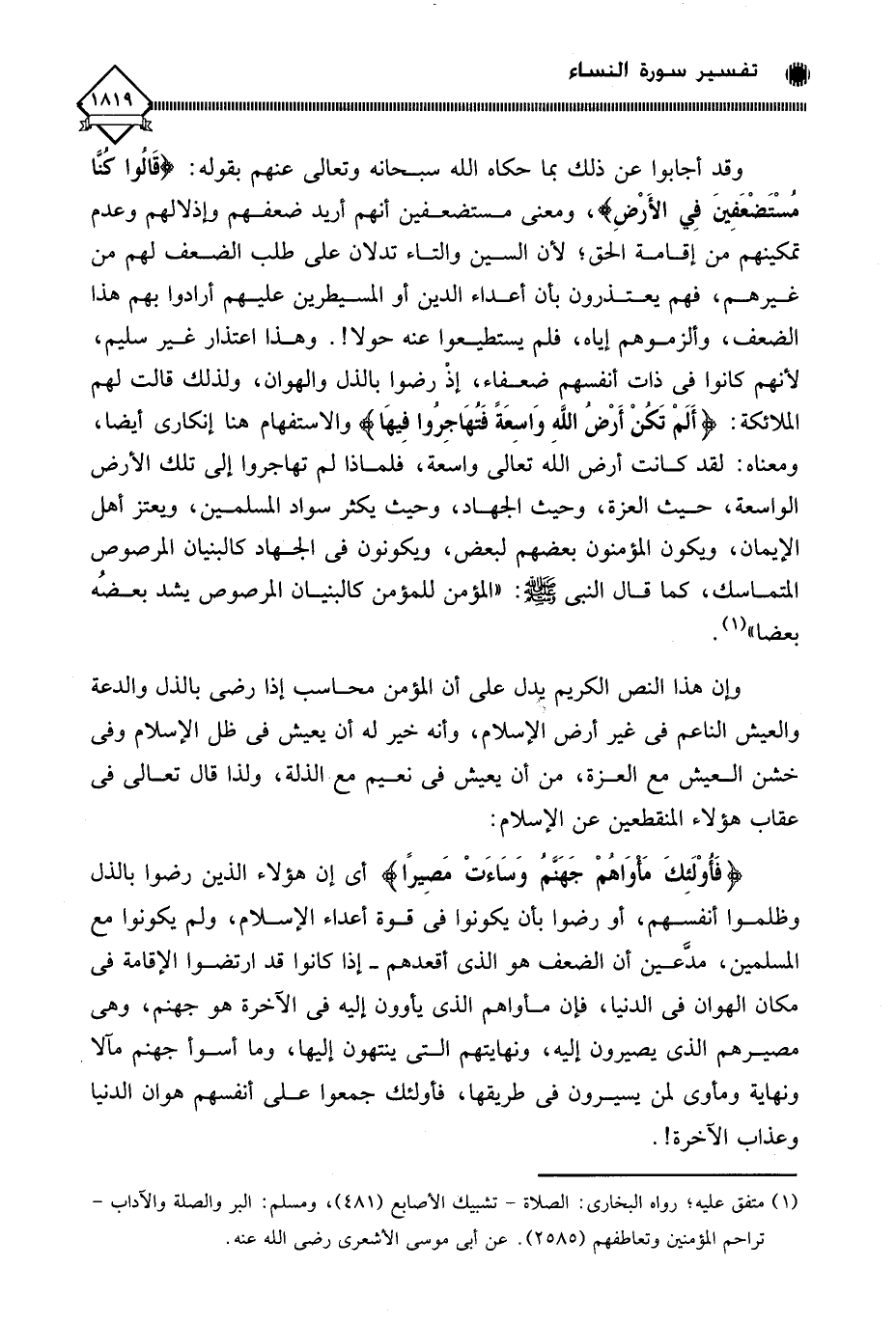 وقد أجابوا عن ذلك بما حكاه الله سبحانه وتعالى عنهم بقوله: (قَالُوا كنَّا مُسْتَضْعَفِينَ فِي الأَرْضِ)، ومعنى مستضعفين أنهم أريد ضعفهم وإذلالهم وعدم تمكينهم من إقامة الحق؛ لأن السين والتاء تدلان على طلب الضعف لهم من غيرهم، فهم يعتذرون بأن أعداء الدين أو المسيطرين عليهم أرادوا بهم هذا الضعف، وألزموهم إياه، فلم يستطيعوا عنه حولا!. وهذا اعتذار غير سليم، لأنهم كانوا في ذات أنفسهم ضعفاء، إذْ رضوا بالذل والهوان، ولذلك قالت لهم الملائكة: (أَلَمْ تَكُنْ أَرْضُ اللَّهِ وَاسِعَةً فَتُهَاجِروا فِيهَا) والاستفهام هنا إنكاري أيضا، ومعناه: لقد كانت أرض الله تعالى واسعة، فلماذا لم تهاجروا إلى تلك الأرض الواسعة، حيث العزة، وحيث الجهاد، وحيث يكثر سواد المسلمين، ويعتز أهل الإيمان، ويكون المؤمنون بعضهم لبعض، ويكونون في الجهاد كالبنيان المرصوص المتماسك، كما قال النبي - صلى الله عليه وسلم -: " المؤمن للمؤمن كالبنيان المرصوص يشد بعضُه بعضا " (¬1).