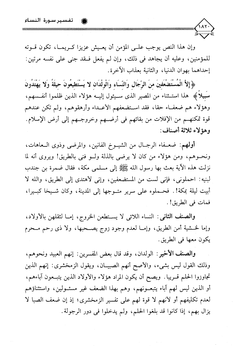 أولهم: ضعفاء الرجال من الشيوخ الفانين، والمرضى وذوي العاهات، ونحوهم، ومن هؤلاء من كان لَا يرضى بالذلة ولو فني بالطريق! ويروى أنه لما نزلت هذه الآية بعث بها رسول الله - صلى الله عليه وسلم - إلى مسلمي مكة، فقال ضمرة بن جندب لبنيه: احملوني، فإني لست من المستضعفين، وإني لأهتدي إلى الطريق، والله لا أبيت ليلة بمكة!. فحملوه على سرير متوجها إلى المدينة، وكان شيخا كبيرا، فمات في الطريق!.