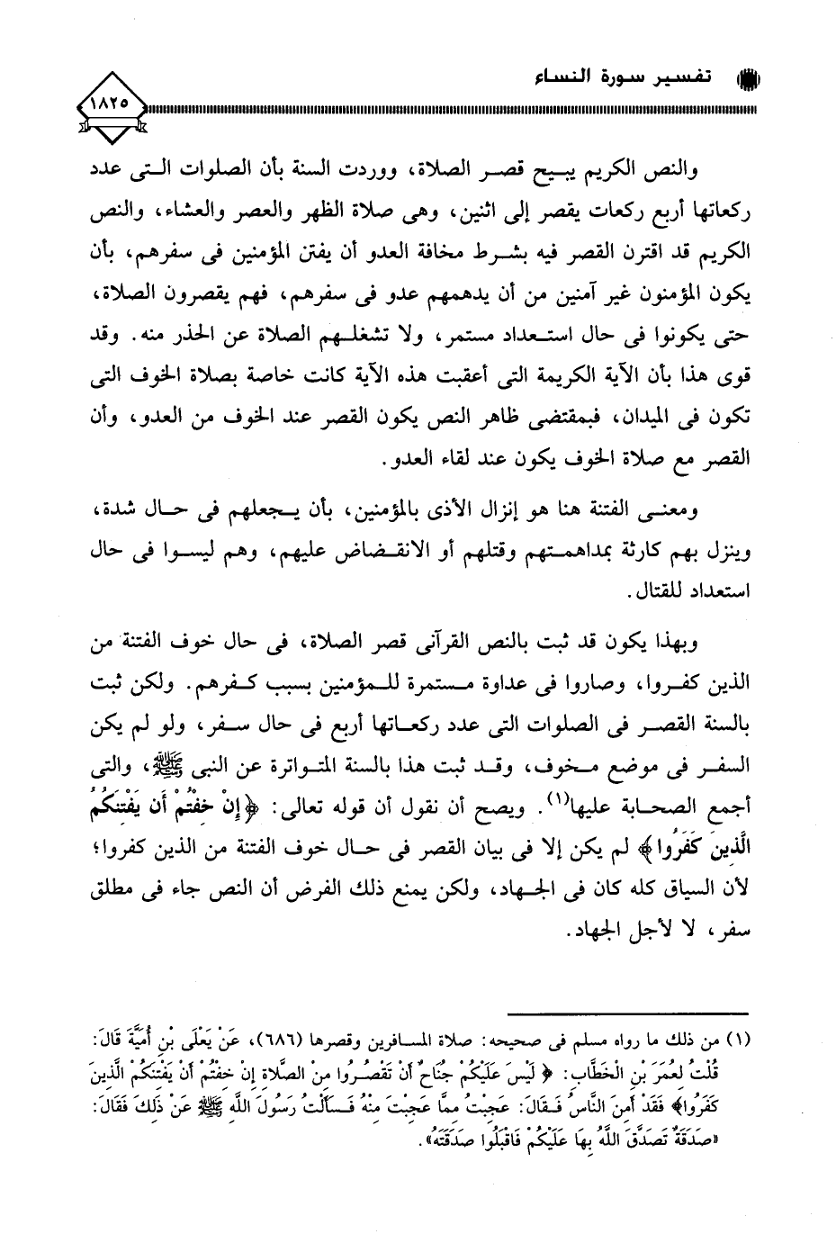 وبهذا يكون قد ثبت بالنص القرآني قصر الصلاة، في حال خوف الفتنة من الذين كفروا، وصاروا في عداوة مستمرة للمؤمنين بسب كفرهم. ولكن ثبت بالسنة القصر في الصلوات التي عدد ركعاتها أربع في حال سفر، ولو لم يكن السفر في موضع مخوف، وقد ثبت هذا بالسنة المتواترة عن النبي - صلى الله عليه وسلم -، والتي أجمعِ الصحابة عليها (¬1). ويصح أن نقول أن قوله تعالى: (إِنْ خِفْتُمْ أَن يَفْتِنَكُمُ الَّذِين كَفَروا) لم يكن إلا في بيان القصر في حال خوف الفتنة من الذين كفروا؛ لأن السياق كله كان في الجهاد، ولكن يمنع ذلك الفرض أن النص جاء في مطلق سفر، لَا لأجل الجهاد.