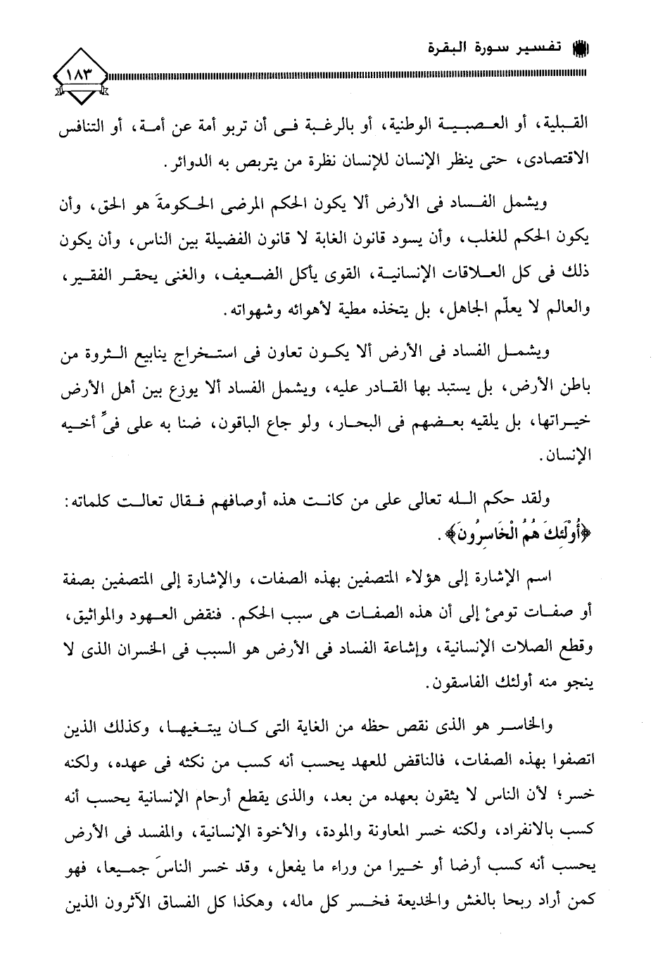 ويشمل الفساد في الأرض ألا يكون الحكم المرضي الحكومةَ هو الحق، وأن يكون الحكم للغلب، وأن يسود قانون الغابة لَا قانون الفضيلة بين الناس، وأن يكون ذلك في كل العلاقات الإنسانية، القوي يأكل الضعيف، والغني يحقر الفقير، والعالم لَا يعلِّم الجاهل، بل يتخذه مطية لأهوائه وشهواته.