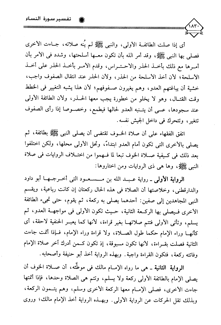 الرواية الأولى - رواية عبد الله بن مسعود التي أخرجها أبو داود والدارقطني، وخلاصتها أن الصلاة في هذه الحال ركعتان إن كانت رباعية، ويقسم النبي المجاهدين إلى صفين: أحدهما يصلي به ركعة، ثم يقوم، حتى تجيء الطائفة الأخرى فيصلي بها الركعة الثانية، حيث تكون الأولى في مواجهة العدو، ثم يسلم، وتأتي الأولى فتتم صلاتها بغير قراءة، لأنها كما يعبر الحنفية لاحقة، أي كأنها وراء الإمام حكما طول الصلاة، ولا قراءة وراء الإمام، فإذا أتمت جاءت الثانية فصلت بقراءة، لأنها تكون مسبوقة، إذ تكون كمن أدرك آخر صلاة الإمام وفاتته ركعة، فتكون القراءة واجبة. وبهذه الرواية أخذ أبو حنيفة وأصحابه.