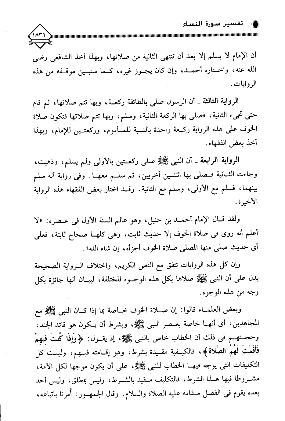 وبعض العلماء قالوا: إن صلاة الخوف خاصة بما إذا كان النبي - صلى الله عليه وسلم - مع المجاهدين، أي أنها خاصة بعصر النبي - صلى الله عليه وسلم -، وبشرط أن يكون هو قائد الجند، وحجتهم في ذلك أن الخطاب خاص بالنبي - صلى الله عليه وسلم -، إذ يقول: (وَإذَا كنتَ فِيهِمْ فَأَقَمْتَ لَهُمُ الصَّلاةَ)، فالكيفية مقيدة بشرط، وهو إقامته فيهم، وليست كل التكليفات التي يوجه فيها الخطاب للنبي - صلى الله عليه وسلم -، على أن يكون موجها لكل الأمة، مشروطا فيها هذا الشرط، فالتكليف مقيد بالشرط، وليس بمطلق، وليس أحد بعده يقوم في الفضل مقامه عليه الصلاة والسلام. وقال الجمهور: أُمرنا باتباعه،