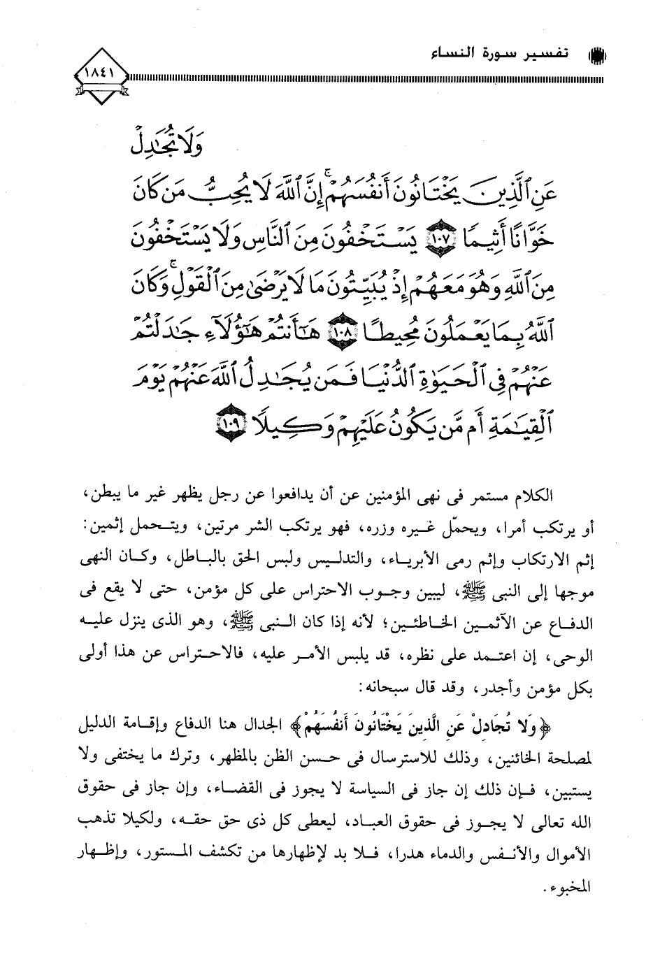 (وَلَا تُجَادِلْ عَنِ الَّذِينَ يَخْتَانُونَ أَنْفُسَهُمْ إِنَّ اللَّهَ لَا يُحِبُّ مَنْ كَانَ خَوَّانًا أَثِيمًا (107) يَسْتَخْفُونَ مِنَ النَّاسِ وَلَا يَسْتَخْفُونَ مِنَ اللَّهِ وَهُوَ مَعَهُمْ إِذْ يُبَيِّتُونَ مَا لَا يَرْضَى مِنَ الْقَوْلِ وَكَانَ اللَّهُ بِمَا يَعْمَلُونَ مُحِيطًا (108) هَا أَنْتُمْ هَؤُلَاءِ جَادَلْتُمْ عَنْهُمْ فِي الْحَيَاةِ الدُّنْيَا فَمَنْ يُجَادِلُ اللَّهَ عَنْهُمْ يَوْمَ الْقِيَامَةِ أَمْ مَنْ يَكُونُ عَلَيْهِمْ وَكِيلًا (109)