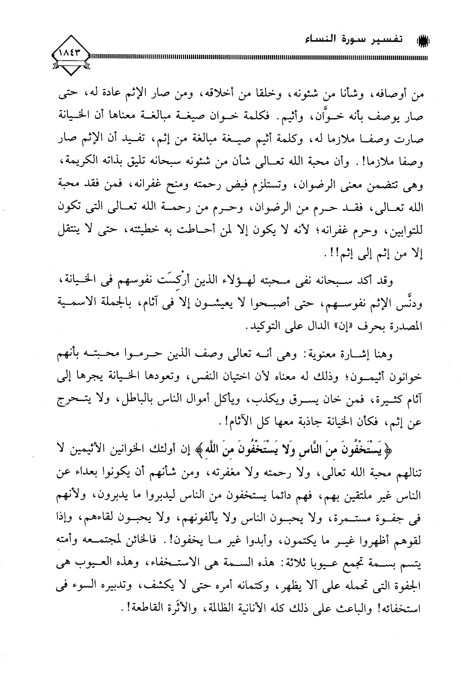 من أوصافه، وشأنا من شئونه، وخلقا من أخلاقه، ومن صار الإثم عادة له، حتى صار يوصف بأنه خوَّان، وأثيم. فكلمة خوان صيغة مبالغة معناها أن الخيانة صارت وصفا ملازما له، وكلمة أثيم صيغة مبالغة من إثم، تفيد أن الإثم صار وصفا ملازما!. وأن محبة الله تعالى شأن من شئونه سبحانه تليق بذاته الكريمة، وهي تتضمن معنى الرضوان، وتستلزم فيض رحمته ومنح غفرانه، فمن فقد محبة الله تعالى، فقد حرم من الرضوان، وحرم من رحمة الله تعالى التي تكون للتوابين، وحرم غفرانه؛ لأنه لَا يكون إلا لمن أحاطت به خطيئته، حتى لَا ينتقل إلا من إثم إلى إثم!!.