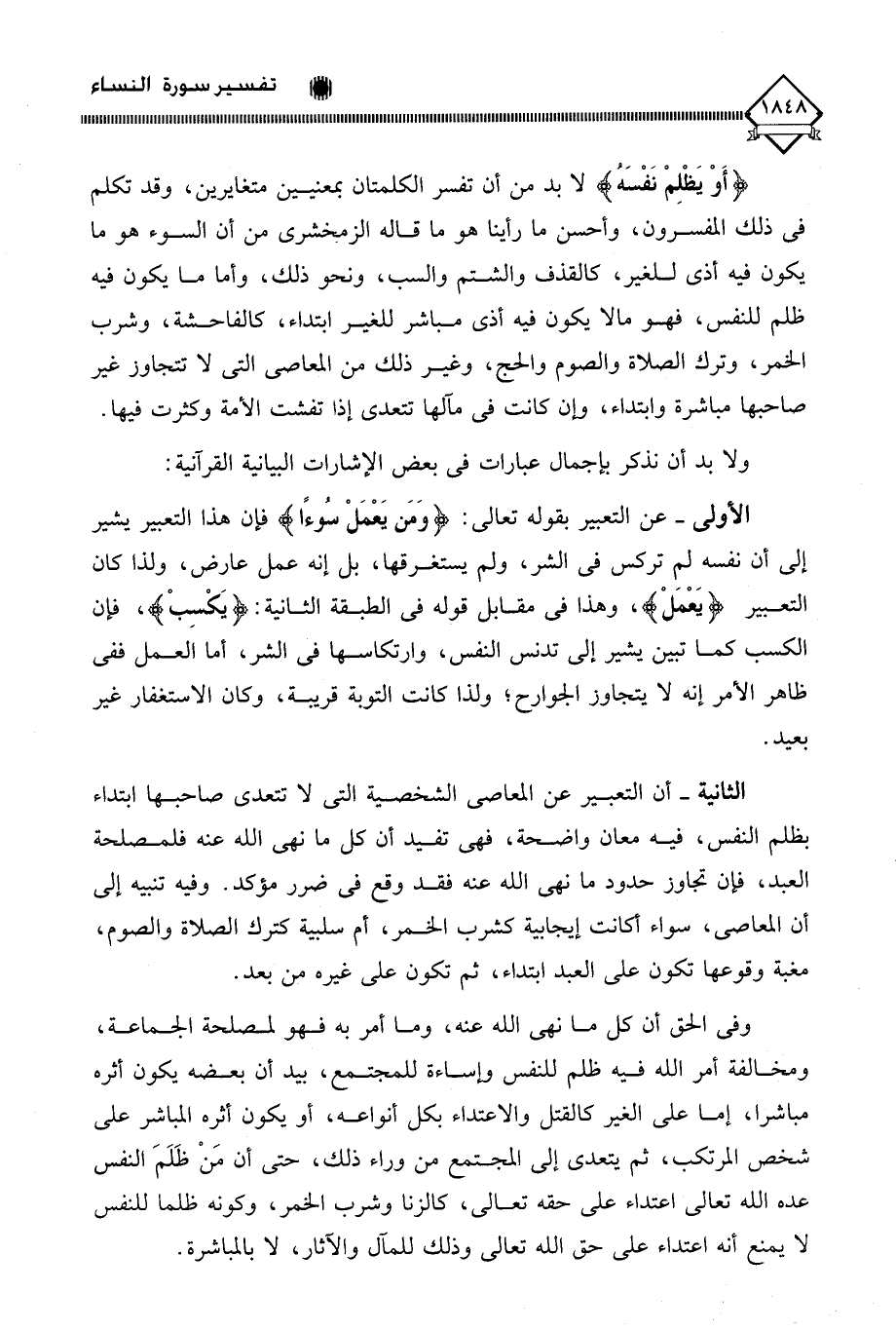 (أَوْ يَظْلِمْ نَفْسَهُ) لَا بد من أن تفسر الكلمتان بمعنيين متغايرين، وقد تكلم في ذلك المفسرون، وأحسن ما رأينا هو ما قاله الزمخشري من أن السوء هو ما يكون فيه أذى للغير، كالقذف والشتم والسب، ونحو ذلك، وأما ما يكون فيه ظلم للنفس، فهو ما لَا يكون فيه أذى مباشر للغير ابتداء، كالفاحشة، وشرب الخمر، وترك الصلاة والصوم والحج، وغير ذلك من المعاصي التي لَا تتجاوز غير صاحبها مباشرة وابتداء، وإن كانت في مآلها تتعدى إذا تفشت الأمة وكثرت فيها.