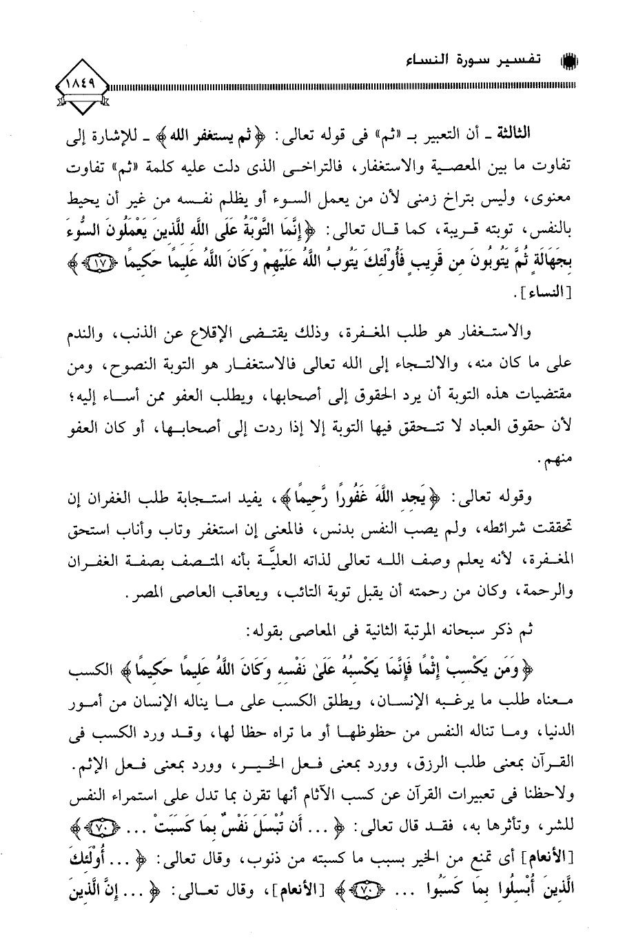الثالثة - أن التعبير بـ " ثم " في قوله تعالى: (ثم يستغفر الله) - للإشارة إلى تفاوت ما بين المعصية والاستغفار، فالتراخي الذي دلت عليه كلمة " ثم " تفاوت معنوي، وليس بتراخ زمني لأن من يعمل السوء أو يظلم نفسه من غير أن يحيط بالنفس، توبته قريبة، كما قال تعالى: (إِنَّمَا التَّوْبَةُ عَلَى اللَّهِ لِلَّذِينَ يَعْمَلُونَ السُّوءَ بِجَهَالَةٍ ثُمَّ يَتُوبُونَ مِنْ قَرِيبٍ فَأُولَئِكَ يَتُوبُ اللَّهُ عَلَيْهِمْ وَكَانَ اللَّهُ عَلِيمًا حَكِيمًا (17).