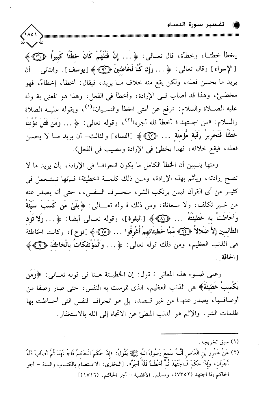 يخطأ خِطئا، وخطأة، قال تعالى: (. . . إِنَّ قَتْلَهُمْ كَانَ خِطْئًا كَبِيرًا)، وقال تعالى: (. . . وَإِن كنَّا لَخَاطِئِينَ). والثاني - أن يريد ما يحسن فعله، ولكن يقع منه خلاف ما يريد، فيقال: أخطأ، إخطاءً، فهو مخطئ، وهذا قد أصاب في الإرادة، وأخطأ في الفعل، وهذا هو المعنى بقوله عليه الصلاة والسلام: " رفع عن أمتي الخطأ والنسيان " (¬1)، وبقوله عليه الصلاة والسلام: " من اجتهد فأخطأ فله أجره " (¬2)، وقوله تعالى: (. . . وَمَنْ قَتَلَ مُؤْمِنًا خَطَأً فَتَحْرِيرُ رَقَبَةٍ مُؤْمِنَةٍ. . .)، والثالث - أن يريد ما لَا يحسن فعله، فيقع خلافه، فهذا يخطئ في الإرادة ومصيب في الفعل).