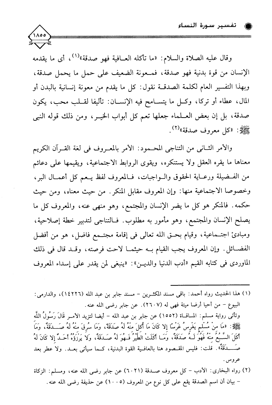 وقال عليه الصلاة والسلام: " ما تأكله العافية فهو صدقة " (¬1)، أي ما يقدمه الإنسان من قوة بدنية فهو صدقة، فمعونة الضعيف على حمل ما يحمل صدقة، وبهذا التفسير العام لكلمة الصدقة نقول: كل ما يقدم من معونة إنسانية بالبدن أو المال، عطاء أو تركا، وكل ما يتسامح فيه الإنسان: تأليفا لقلب محب، يكون صدقة، بل إن بعض العلماء جعلها تعم كل أبواب الخير، ومن ذلك قوله النبي - صلى الله عليه وسلم -: " كل معروف صدقة " (¬2).