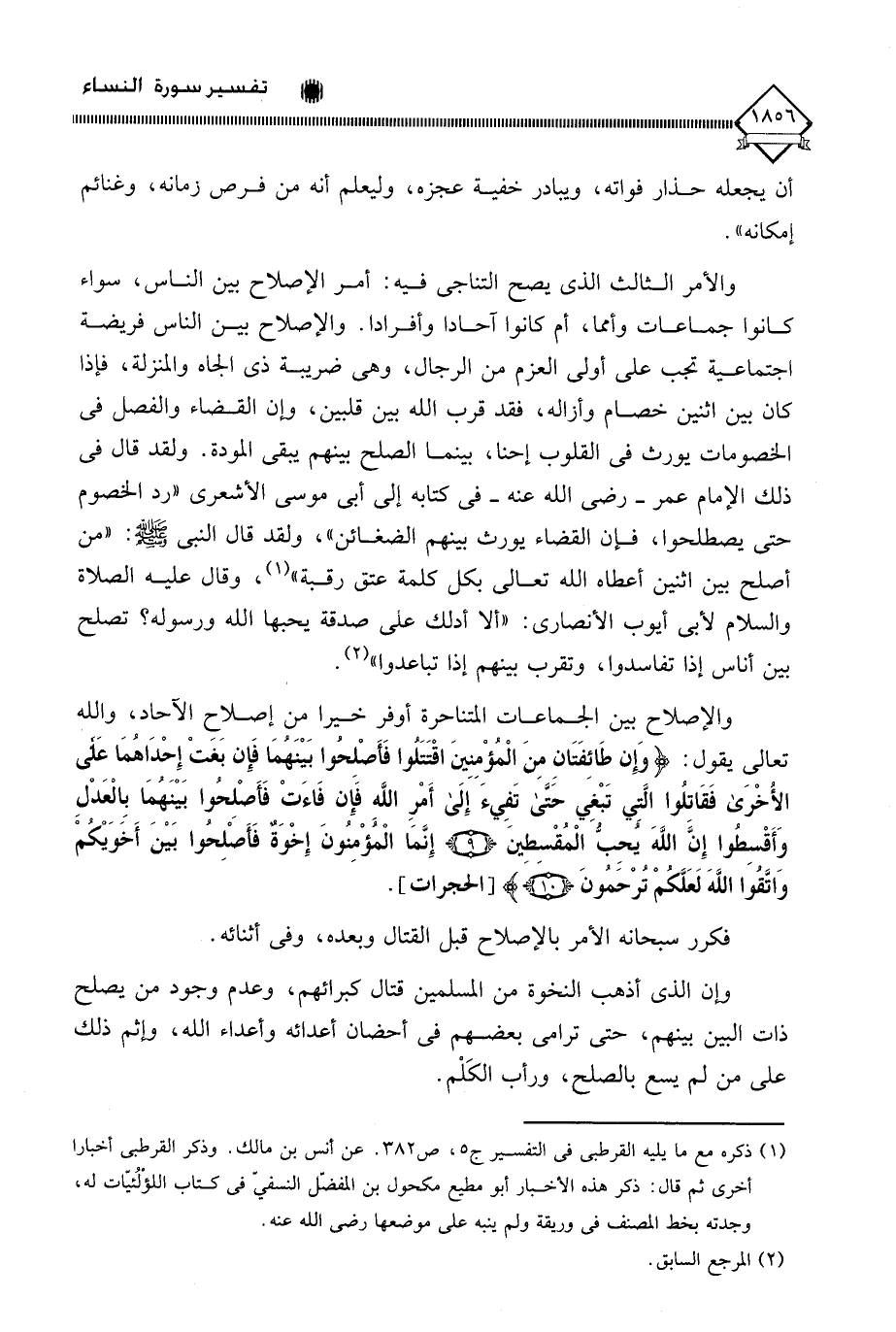 تعالى يقول: (وَإِنْ طَائِفَتَانِ مِنَ الْمُؤْمِنِينَ اقْتَتَلُوا فَأَصْلِحُوا بَيْنَهُمَا فَإِنْ بَغَتْ إِحْدَاهُمَا عَلَى الْأُخْرَى فَقَاتِلُوا الَّتِي تَبْغِي حَتَّى تَفِيءَ إِلَى أَمْرِ اللَّهِ فَإِنْ فَاءَتْ فَأَصْلِحُوا بَيْنَهُمَا بِالْعَدْلِ وَأَقْسِطُوا إِنَّ اللَّهَ يُحِبُّ الْمُقْسِطِينَ (9) إِنَّمَا الْمُؤْمِنُونَ إِخْوَةٌ فَأَصْلِحُوا بَيْنَ أَخَوَيْكُمْ وَاتَّقُوا اللَّهَ لَعَلَّكُمْ تُرْحَمُونَ (10). فكرر سبحانه الأمر بالإصلاح قبل القتال وبعده، وفي أثنائه.
