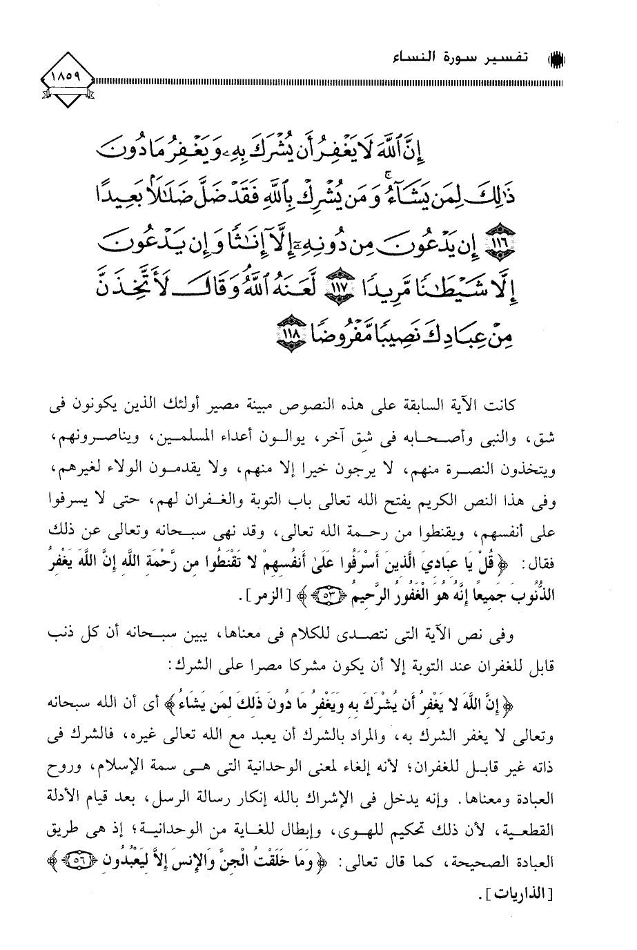 (إِنَّ اللَّهَ لَا يَغْفِرُ أَنْ يُشْرَكَ بِهِ وَيَغْفِرُ مَا دُونَ ذَلِكَ لِمَنْ يَشَاءُ وَمَنْ يُشْرِكْ بِاللَّهِ فَقَدْ ضَلَّ ضَلَالًا بَعِيدًا (116) إِنْ يَدْعُونَ مِنْ دُونِهِ إِلَّا إِنَاثًا وَإِنْ يَدْعُونَ إِلَّا شَيْطَانًا مَرِيدًا (117) لَعَنَهُ اللَّهُ وَقَالَ لَأَتَّخِذَنَّ مِنْ عِبَادِكَ نَصِيبًا مَفْرُوضًا (118)