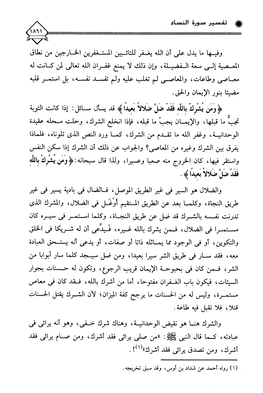 والشرك هنا هو نقيض الوحدانية، وهناك شرك خفي، وهو أنه يرائي في عبادته، كما قال النبي - صلى الله عليه وسلم -: " من صلى يرائي فقد أشرك، ومن صام يرائي فقد أشرك، ومن تصدق يرائي فقد أشرك " (¬1)!.
