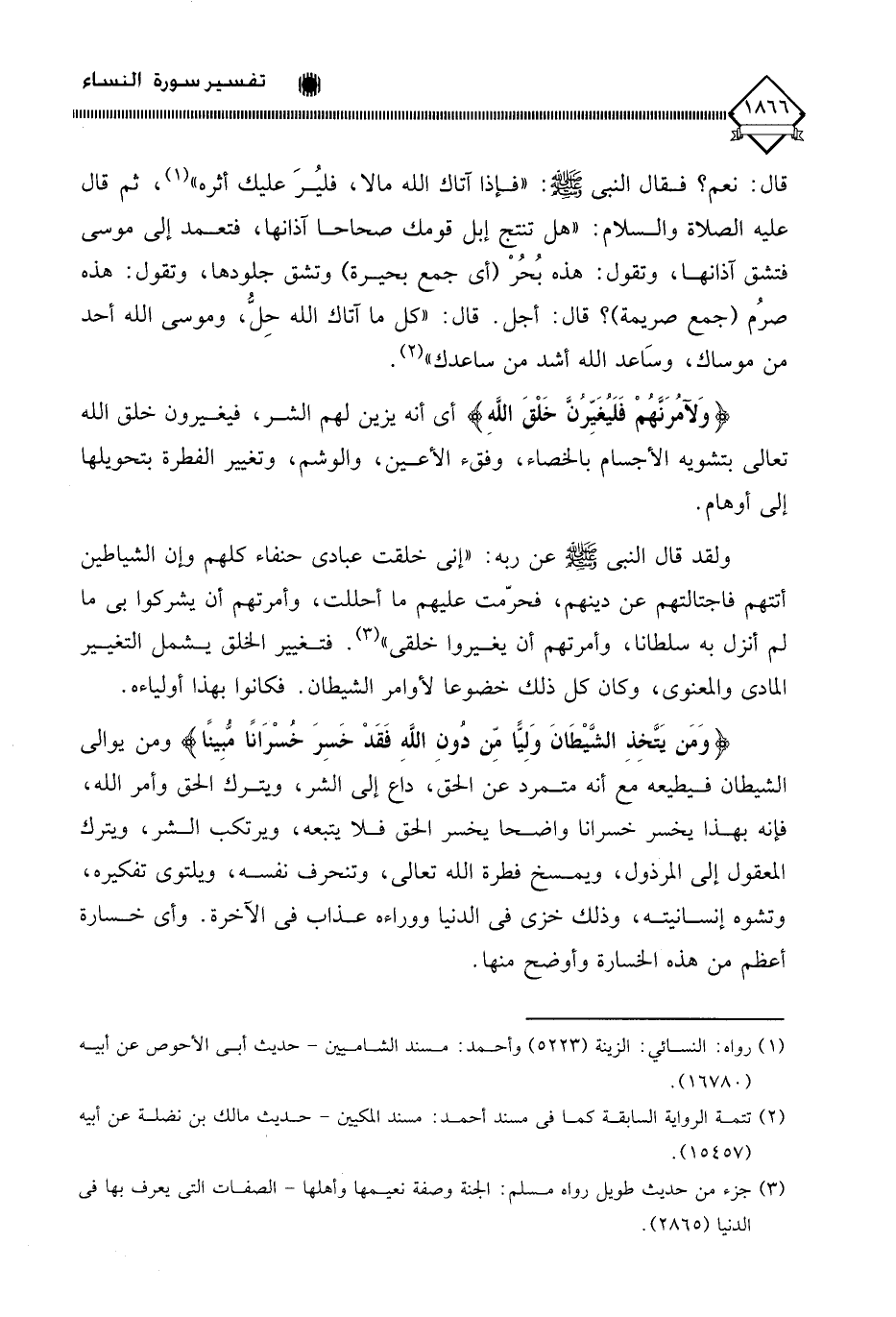 ولقد قال النبي - صلى الله عليه وسلم - عن ربه: " إني خلقت عبادي حنفاء كلهم وإن الشياطين أتتهم فاجتالتهم عن دينهم، فحرّمت عليهم ما أحللت، وأمرتهم أن يشركوا بي ما لم أنزل به سلطانا، وأمرتهم أن يغيروا خلقي " (¬3). فتغيير الخلق يشمل التغيير المادي والمعنوي، وكان كل ذلك خضوعا لأوامر الشيطان. فكانوا بهذا أولياءه.