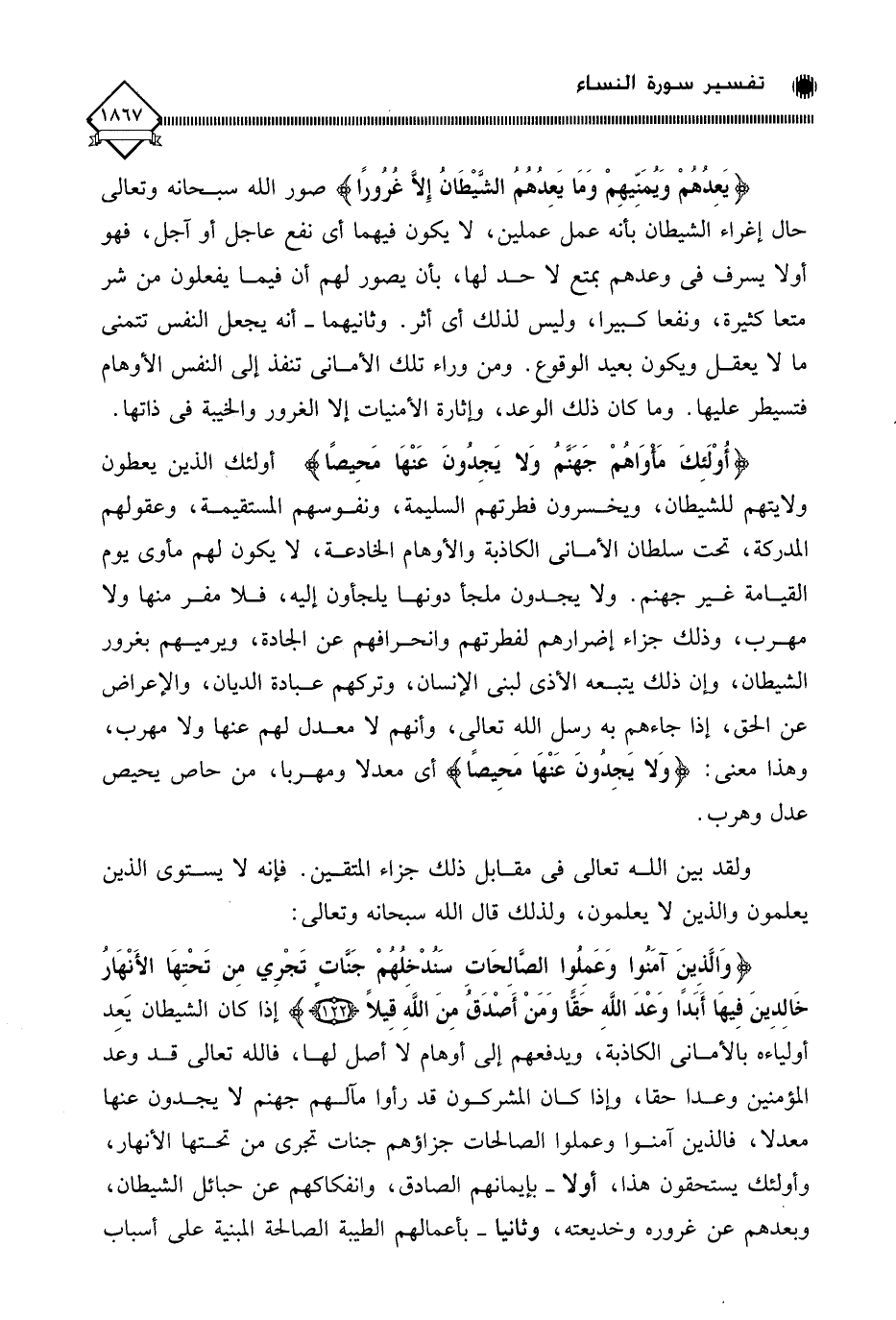 أولئك الذين يعطون ولايتهم للشيطان، ويخسرون فطرتهم السليمة، ونفوسهم المستقيمة، وعقولهم المدركة، تحت سلطان الأماني الكاذبة والأوهام الخادعة، لَا يكون لهم مأوى يوم القيامة غير جهنم. ولا يجدون ملجأ دونها يلجأون إليه، فلا مفر منها ولا مهرب، وذلك جزاء إضرارهم لفطرتهم وانحرافهم عن الجادة، ويرميهم بغرور الشيطان، وإن ذلك يتبعه الأذى لبني الإنسان، وتركهم عبادة الديان، والإعراض عن الحق، إذا جاءهم به رسل الله تعالى، وأنهم لَا معدل لهم عنها ولا مهرب، وهذا معنى: (وَلا يَجِدُونَ عَنْهَا مَحِيصًا) أي معدلا ومهربا، من حاص يحيص عدل وهرب.