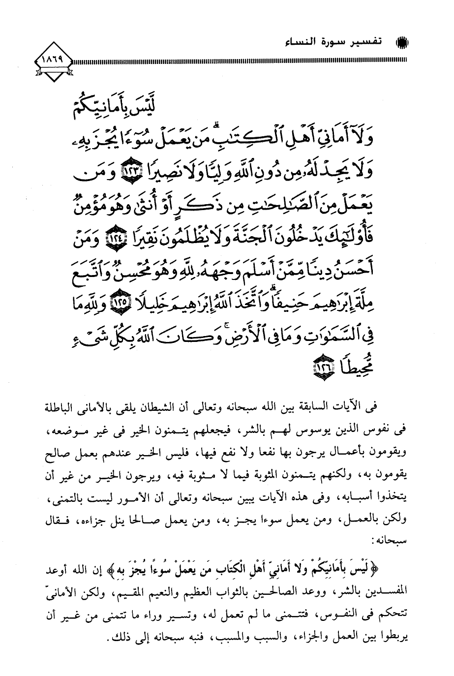 (لَيْسَ بِأَمَانِيِّكُمْ وَلَا أَمَانِيِّ أَهْلِ الْكِتَابِ مَنْ يَعْمَلْ سُوءًا يُجْزَ بِهِ وَلَا يَجِدْ لَهُ مِنْ دُونِ اللَّهِ وَلِيًّا وَلَا نَصِيرًا (123) وَمَنْ يَعْمَلْ مِنَ الصَّالِحَاتِ مِنْ ذَكَرٍ أَوْ أُنْثَى وَهُوَ مُؤْمِنٌ فَأُولَئِكَ يَدْخُلُونَ الْجَنَّةَ وَلَا يُظْلَمُونَ نَقِيرًا (124) وَمَنْ أَحْسَنُ دِينًا مِمَّنْ أَسْلَمَ وَجْهَهُ لِلَّهِ وَهُوَ مُحْسِنٌ وَاتَّبَعَ مِلَّةَ إِبْرَاهِيمَ حَنِيفًا وَاتَّخَذَ اللَّهُ إِبْرَاهِيمَ خَلِيلًا (125) وَلِلَّهِ مَا فِي السَّمَاوَاتِ وَمَا فِي الْأَرْضِ وَكَانَ اللَّهُ بِكُلِّ شَيْءٍ مُحِيطًا (126)