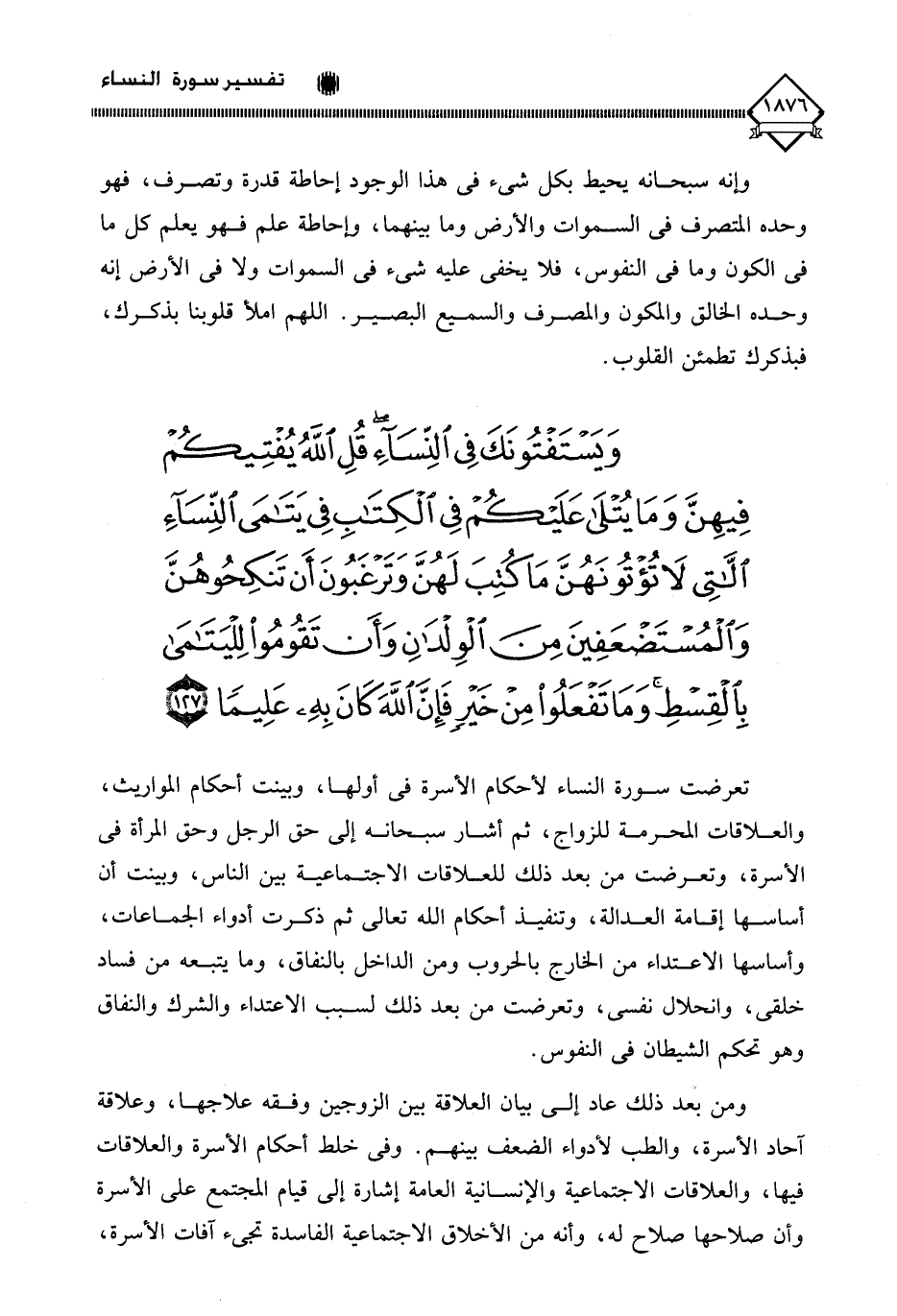 (وَيَسْتَفْتُونَكَ فِي النِّسَاءِ قُلِ اللَّهُ يُفْتِيكُمْ فِيهِنَّ وَمَا يُتْلَى عَلَيْكُمْ فِي الْكِتَابِ فِي يَتَامَى النِّسَاءِ اللَّاتِي لَا تُؤْتُونَهُنَّ مَا كُتِبَ لَهُنَّ وَتَرْغَبُونَ أَنْ تَنْكِحُوهُنَّ وَالْمُسْتَضْعَفِينَ مِنَ الْوِلْدَانِ وَأَنْ تَقُومُوا لِلْيَتَامَى بِالْقِسْطِ وَمَا تَفْعَلُوا مِنْ خَيْرٍ فَإِنَّ اللَّهَ كَانَ بِهِ عَلِيمًا (127)
