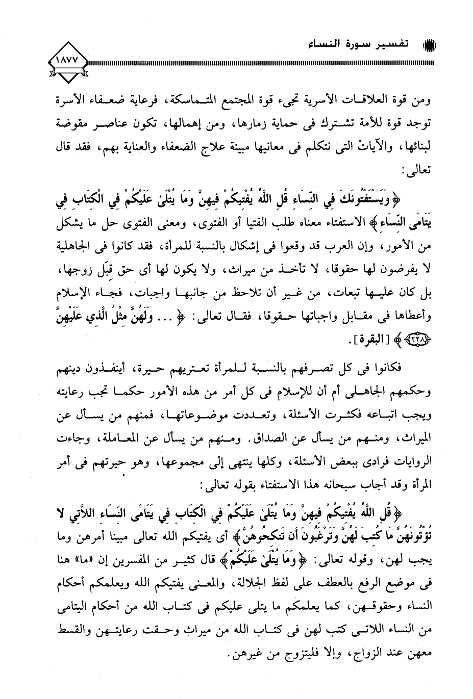 (وَيَسْتَفْتُونَكَ فِي النِّسَاءِ قُلِ اللَّهُ يُفْتِيكُمْ فِيهِنَّ وَمَا يُتْلَى عَلَيْكُمْ فِي الْكِتَابِ فِي يَتَامَى النِّسَاءِ) الاستفتاء معناه طلب الفتيا أو الفتوى، ومعنى الفتوى حل ما يشكل من الأمور، وإن العرب قد وقعوا في إشكال بالنسبة للمرأة، فقد كانوا في الجاهلية لا يفرضون لها حقوقا، لَا تأخذ من ميراث، ولا يكون لها أي حق قِبَل زوجها، بل كان عليها تبعات، من غير أن تلاحظ من جانبها واجبات، فجاء الإسلام وأعطاها في مقابل واجباتها حقوقا، فقال تعالى: (. . . وَلَهُنَّ مِثْلُ الَّذِي عَلَيْهِنَّ).