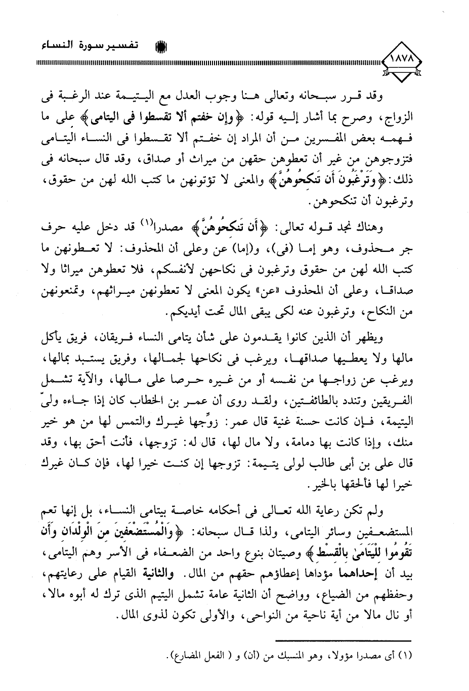 وقد قرر سبحانه وتعالى هنا وجوب العدل مع اليتيمة عند الرغبة في الزواج، وصرح بما أشار إليه قوله: (وإِن خفتم ألا تقسطوا في اليتامى) على ما فهمه بعض المفسرين من أن المراد إن خفتم ألا تقسطوا في النساء اليتامى فتزوجوهن من غير أن تعطوهن حقهن من ميراث أو صداق، وقد قال سبحانه في ذلك: (وَترْغَبُونَ أَن تَنكِحُوهُنَّ) والمعنى لَا تؤتونهن ما كتب الله لهن من حقوق، وترغبون أن تنكحوهن.