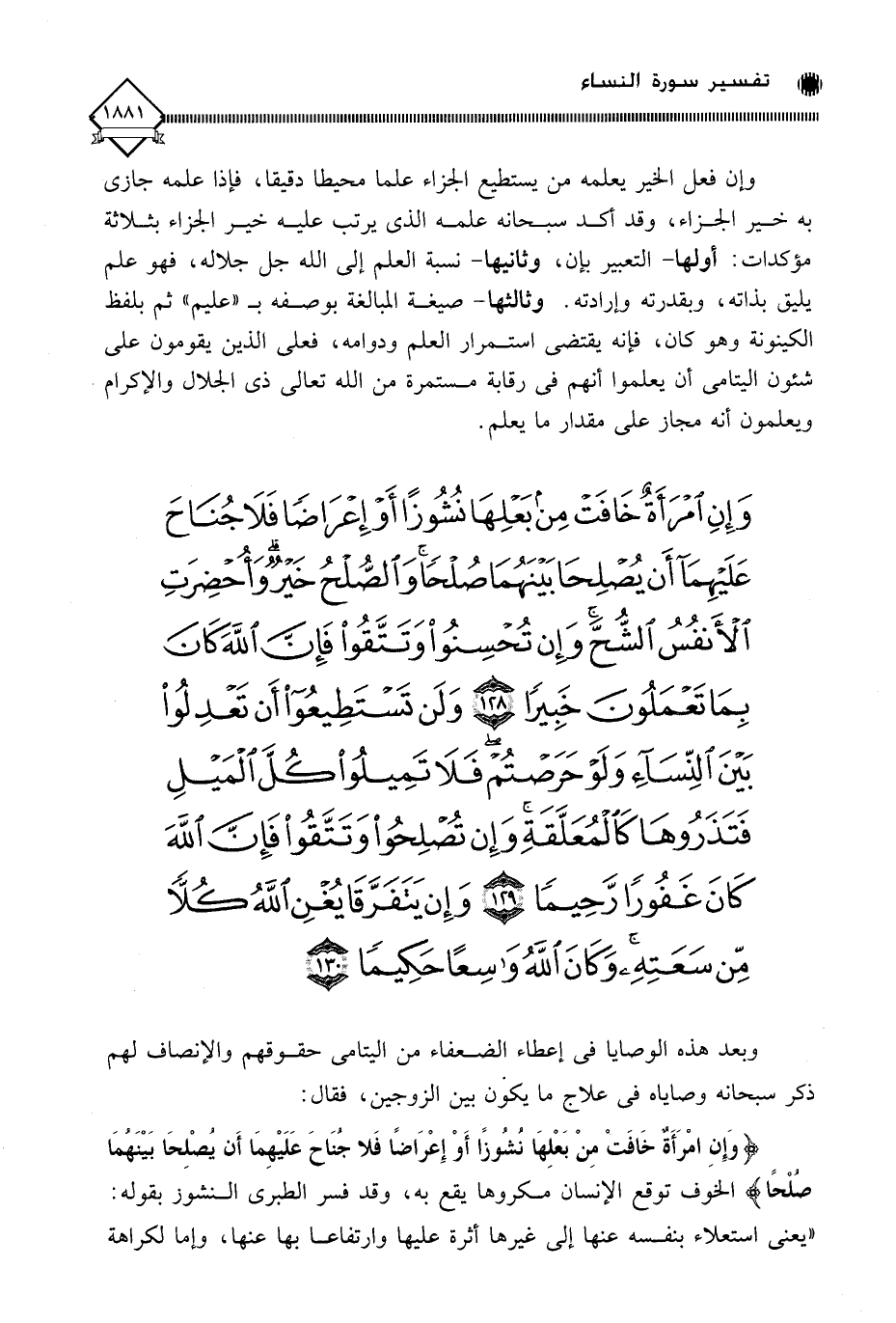 (وَإِنِ امْرَأَةٌ خَافَتْ مِنْ بَعْلِهَا نُشُوزًا أَوْ إِعْرَاضًا فَلَا جُنَاحَ عَلَيْهِمَا أَنْ يُصْلِحَا بَيْنَهُمَا صُلْحًا وَالصُّلْحُ خَيْرٌ وَأُحْضِرَتِ الْأَنْفُسُ الشُّحَّ وَإِنْ تُحْسِنُوا وَتَتَّقُوا فَإِنَّ اللَّهَ كَانَ بِمَا تَعْمَلُونَ خَبِيرًا (128) وَلَنْ تَسْتَطِيعُوا أَنْ تَعْدِلُوا بَيْنَ النِّسَاءِ وَلَوْ حَرَصْتُمْ فَلَا تَمِيلُوا كُلَّ الْمَيْلِ فَتَذَرُوهَا كَالْمُعَلَّقَةِ وَإِنْ تُصْلِحُوا وَتَتَّقُوا فَإِنَّ اللَّهَ كَانَ غَفُورًا رَحِيمًا (129) وَإِنْ يَتَفَرَّقَا يُغْنِ اللَّهُ كُلًّا مِنْ سَعَتِهِ وَكَانَ اللَّهُ وَاسِعًا حَكِيمًا (130)