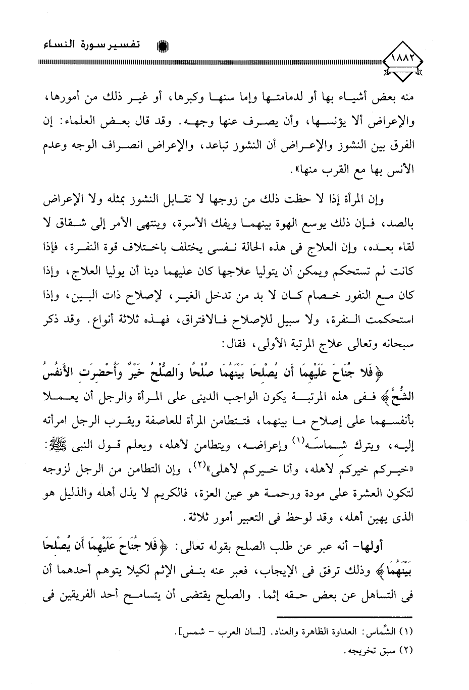 وإن المرأة إذا لَا حظت ذلك من زوجها لَا تقابل النشوز بمثله ولا الإعراض بالصد، فإن ذلك يوسع الهوة بينهما ويفك الأسرة، وينتهي الأمر إلى شقاق لا لقاء بعده، وإن العلاج في هذه الحالة نفسي يختلف باختلاف قوة النفرة، فإذا كانت لم تستحكم ويمكن أن يتوليا علاجها كان عليهما دينا أن يوليا العلاج، وإذا كان مع النفور خصام كان لَا بد من تدخل الغير، لإصلاح ذات البين، وإذا استحكمت النفرة، ولا سبيل للإصلاح فالافتراق، فهذه ثلاثة أنواع. وقد ذكر سبحانه وتعالى علاج المرتبة الأولى، فقال: