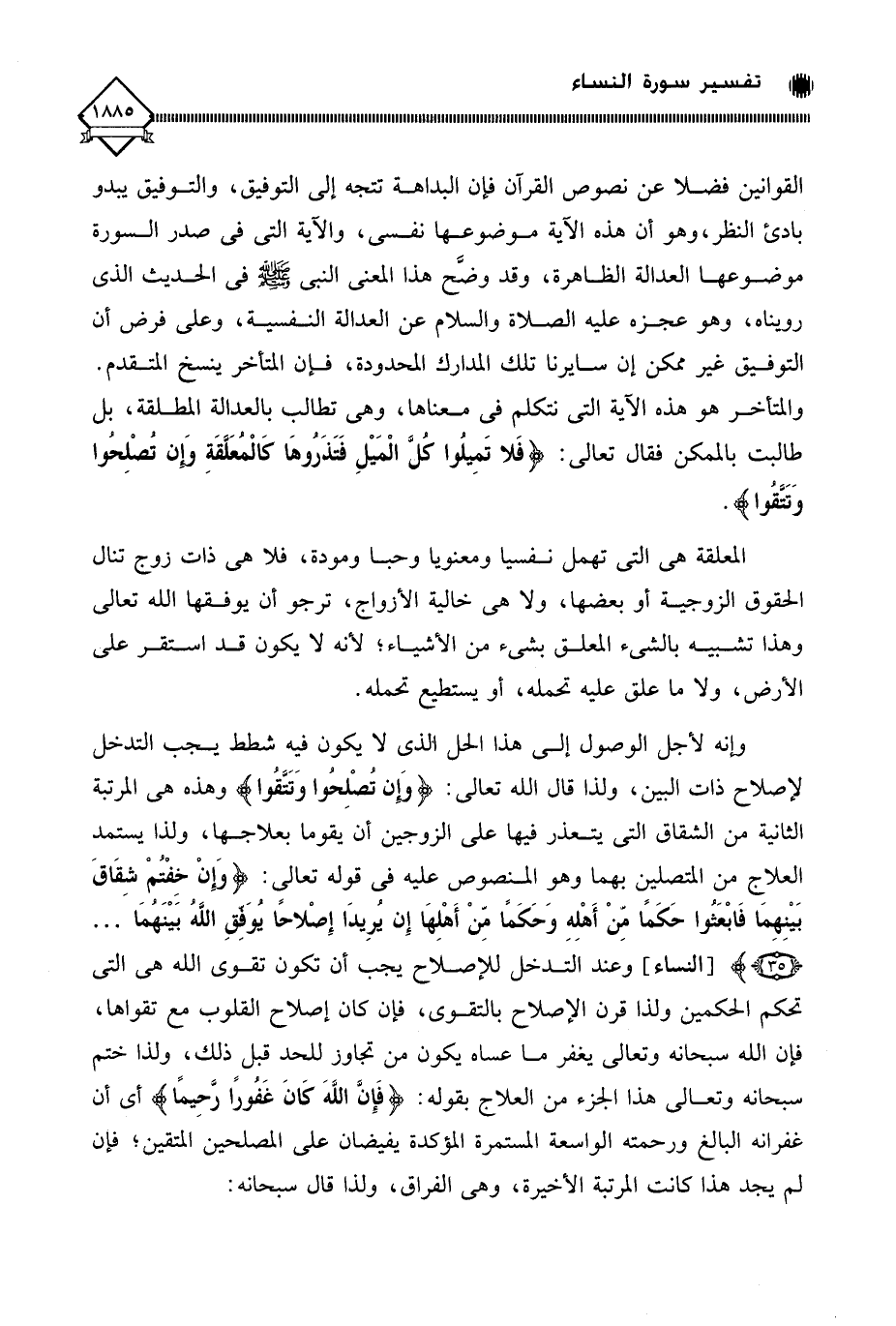 القوانين فضلا عن نصوص القرآن فإن البداهة تتجه إلى التوفيق، والتوفيق يبدو بادئ النظر، وهو أن هذه الآية موضوعها نفسي، والآية التي في صدر السورة موضوعها العدالة الظاهرة، وقد وضَّح هذا المعنى النبي - صلى الله عليه وسلم - في الحديث الذي رويناه، وهو عجزه عليه الصلاة والسلام عن العدالة النفسية، وعلى فرض أن التوفيق غير ممكن إن سايرنا تلك المدارك المحدودة، فإن المتأخر ينسخ المتقدم. والمتأخر هو هذه الآية التي نتكلم في معناها، وهي تطالب بالعدالة المطلقة، بل طالبت بالممكن فقال تعالى: (فَلَا تَمِيلُوا كُلَّ الْمَيْلِ فَتَذَرُوهَا كَالْمُعَلَّقَةِ وَإِنْ تُصْلِحُوا وَتَتَّقُوا).