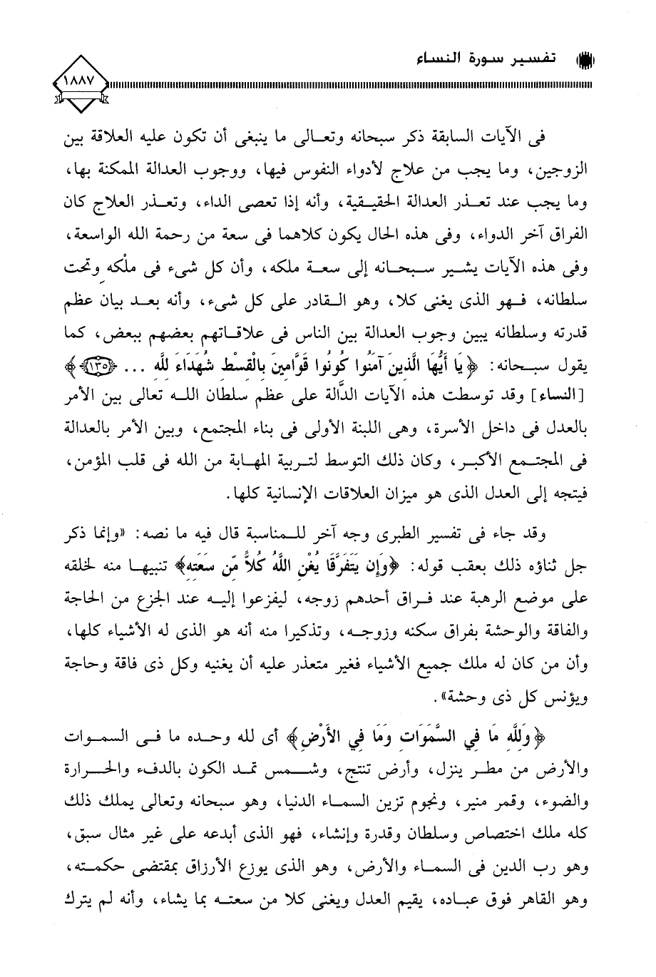 فى الآيات السابقة ذكر سبحانه وتعالى ما ينبغي أن تكون عليه العلاقة بين الزوجين، وما يجب من علاج لأدواء النفوس فيها، ووجوب العدالة الممكنة بها، وما يجب عند تعذر العدالة الحقيقية، وأنه إذا تعصى الداء، وتعذر العلاج كان الفراق آخر الدواء، وفي هذه الحال يكون كلاهما في سعة من رحمة الله الواسعة، وفى هذه الآيات يشير سبحانه إلى سعة ملكه، وأن كل شيء في ملْكهِ وتحت سلطانه، فهو الذي يغني كلا، وهو القادر على كل شيء، وأنه بعد بيان عظم قدرته وسلطانه يبين وجوب العدالة بين الناس في علاقاتهم بعضهم ببعض، كما يقول سبحانه: (يَا أَيّهَا الَّذينَ آمَنُوا كُونُوا قَوَّامينَ بِالْقسْط شُهَدَاءَ للَّه. . .)، وقد توسطت هذه الآيات الدَّالة علي عظم سلطَان الله تعالى بين الأمر بالعدل في داخل الأسرة، وهي اللبنة الأولى في بناء المجتمع، وبين الأمر بالعدالة في المجتمع الأكبر، وكان ذلك التوسط لتربية المهابة من الله في قلب المؤمن، فيتجه إلى العدل الذي هو ميزان العلاقات الإنسانية كلها.