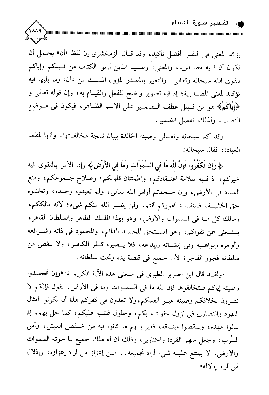 ولقد قال ابن جرير الطبري في معنى هذه الآية الكريمة: " وإن تجحدوا وصيته إياكم فتخالفوها فإن لله ما في السماوات وما في الأرض. يقول فإنكم لا تضرون بخلافكم وصيته غير أنفسكم، ولا تعدون في كفركم هذا أن تكونوا أمثال اليهود والنصارى في نزول عقوبته بكم، وحلول غضبه عليكم، كما حل بهم، إذ بدلوا عهده، ونقضوا ميثاقه، فغير بهم ما كانوا فيه من خفض العيش، وأمن السِّرب، وجعل منهم القردة والخنازير، وذلك أن له ملك جميع ما حوته السماوات والأرض، لَا يمتنع عليه شيء أراد تجميعه. . من إعزاز من أراد إعزازه، وإذلال من أراد إذلاله ".