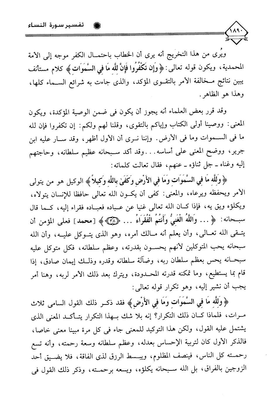 وقد قرر بعض العلماء أنه يجوز أن يكون في ضمن الوصية المؤكدة، ويكون المعنى: ووصينا أولي الكتاب وإياكم بالتقوى، وقلنا لهم ولكم: إن تكفروا فإن لله ما في السماوات وما في الأرض. وإننا نرى أن الأول أظهر، وقد سار عليه ابن جرير، ووضح المعنى على أساسه. . . وقد أكد سبحانه عظيم سلطانه، وحاجتهم إليه وغناه - جل ثناؤه - عنهم، فقال تعالت كلماته: