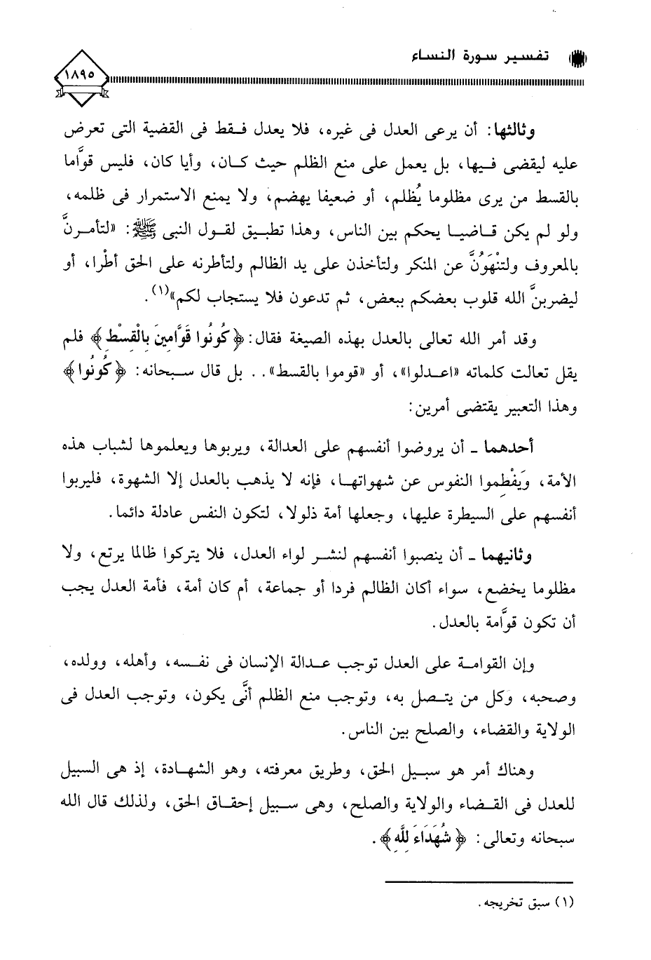 وإن القوامة على العدل توجب عدالة الإنسان في نفسه، وأهله، وولده، وصحبه، وكل من يتصل به، وتوجب منع الظلم أنَّى يكون، وتوجب العدل في الولاية والقضاء، والصلح بين الناس.