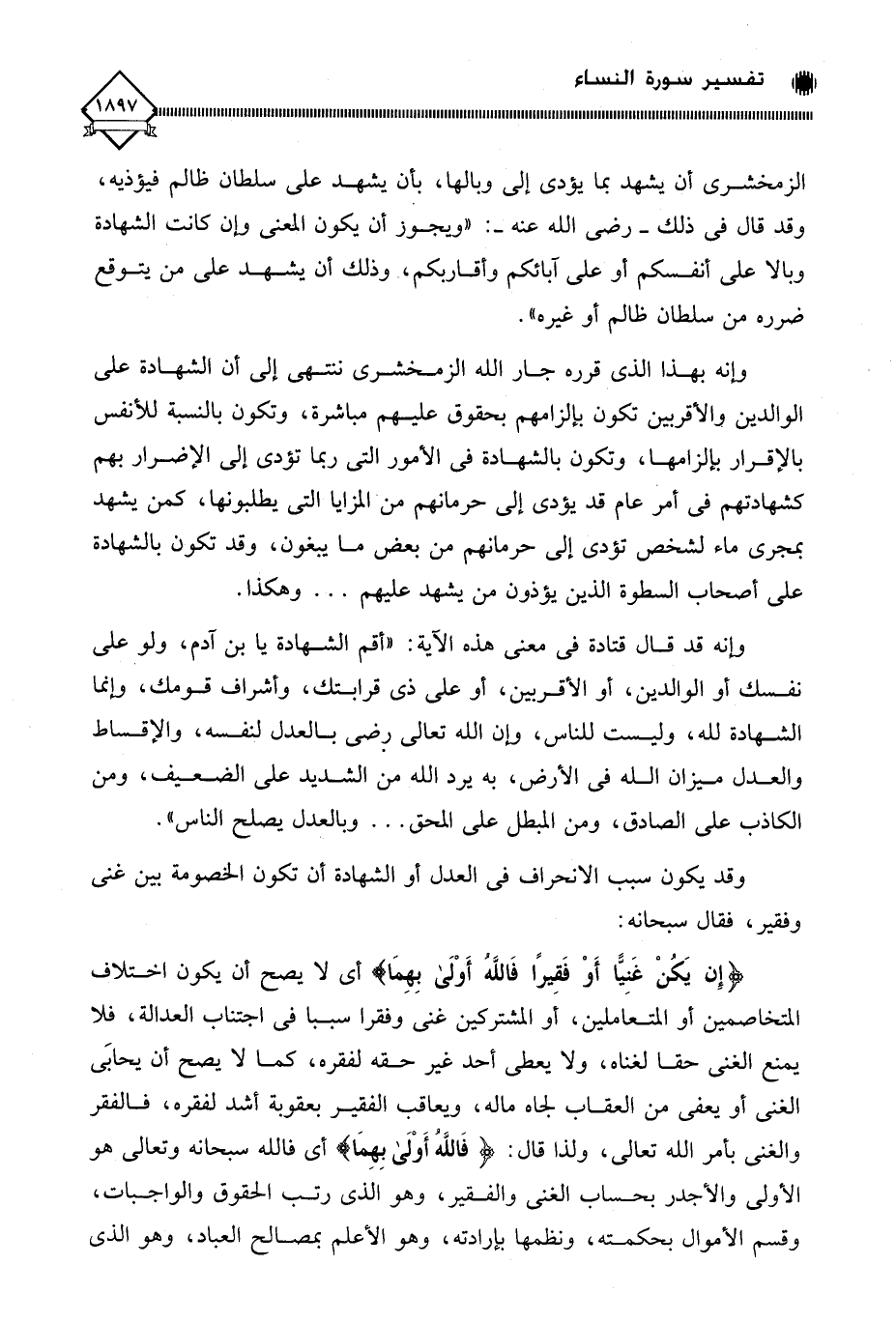 وإنه بهذا الذي قرره جار الله الزمخشري ننتهي إلى أن الشهادة على الوالدين والأقربين تكون بإلزامهم بحقوق عليهم مباشرة، وتكون بالنسبة للأنفس بالإقرار بإلزامها، وتكون بالشهادة في الأمور التي ربما تؤدي إلى الإضرار بهم كشهادتهم في أمر عام قد يؤدي إلى حرمانهم من المزايا الاي يطلبونها، كمن يشهد بمجرى ماء لشخص تؤدي إلى حرمانهم من بعض ما يبغون، وقد تكون بالشهادة على أصحاب السطوة الذين يؤذون من يشهد عليهم. . . وهكذا.