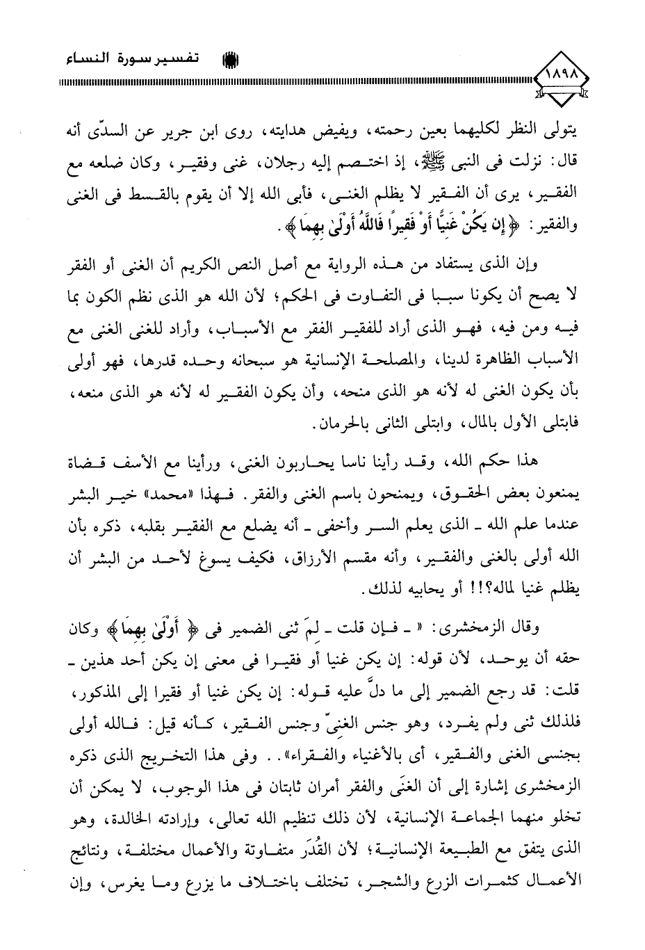 وقال الزمخشري: " - فإن قلت - لِمَ ثنى الضمير في (أَوْلَى بِهِمَا) وكان حقه أن يوحد، لأن قوله: إن يكن غنيا أو فقيرا في معنى إن يكن أحد هذين - قلت: قد رجع الضمير إلى ما دلَّ عليه قوله: إن يكن غنيا أو فقيرا إلى المذكور، فلذلك ثنى ولم يفرد، وهو جنس الغنِيّ وجنس الفقير، كأنه قيل: فالله أولى بجنسي الغني والفقير، أي بالأغنياء والفقراء ". . وفي هذا التخريج الذي ذكره الزمخشري إشارة إلى أن الغنَى والفقر أمران ثابتان في هذا الوجوب، لَا يمكن أن تخلو منهما الجماعة الإنسانية، لأن ذلك تنظيم الله تعالى، وإرادته الخالدة، وهو الذي يتفق مع الطبيعة الإنسانية؛ لأن القُدَر متفاوتة والأعمال مختلفة، ونتائج الأعمال كثمرات الزرع والشجر، تختلف باختلاف ما يزرع وما يغرس، وإن