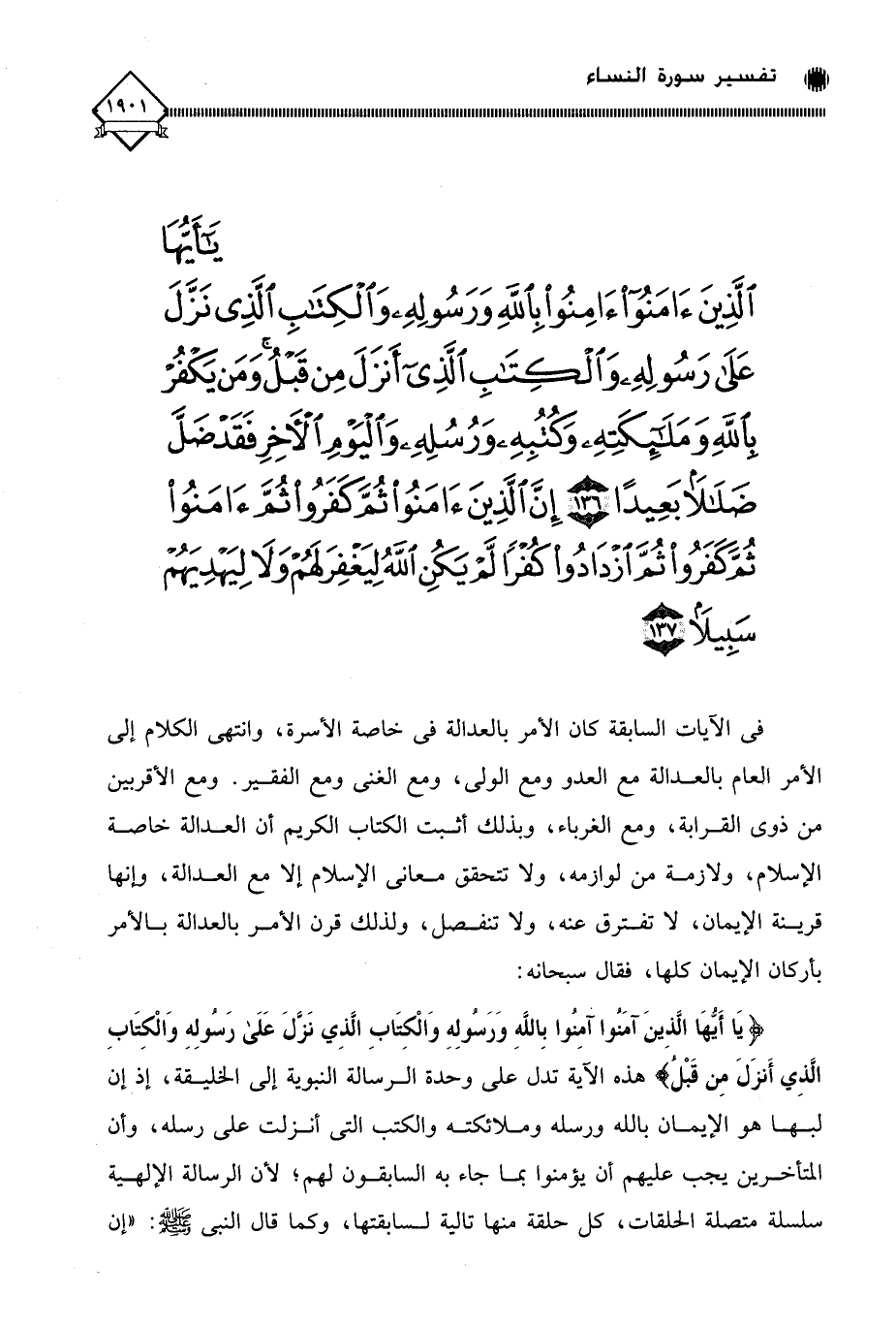 في الآيات السابقة كان الأمر بالعدالة في خاصة الأسرة، وانتهى الكلام إلى الأمر العام بالعدالة مع العدو ومع الولي، ومع الغني ومع الفقير. ومع الأقربين من ذوي القرابة، ومع الغرباء، وبذلك أثبت الكتاب الكريم أن العدالة خاصة الإسلام، ولازمة من لوازمه، ولا تتحقق معاني الإسلام إلا مع العدالة، وإنها قرينة الإيمان، لَا تفترق عنه، ولا تنفصل، ولذلك قرن الأمر بالعدالة بالأمر بأركان الإيمان كلها، فقال سبحانه: