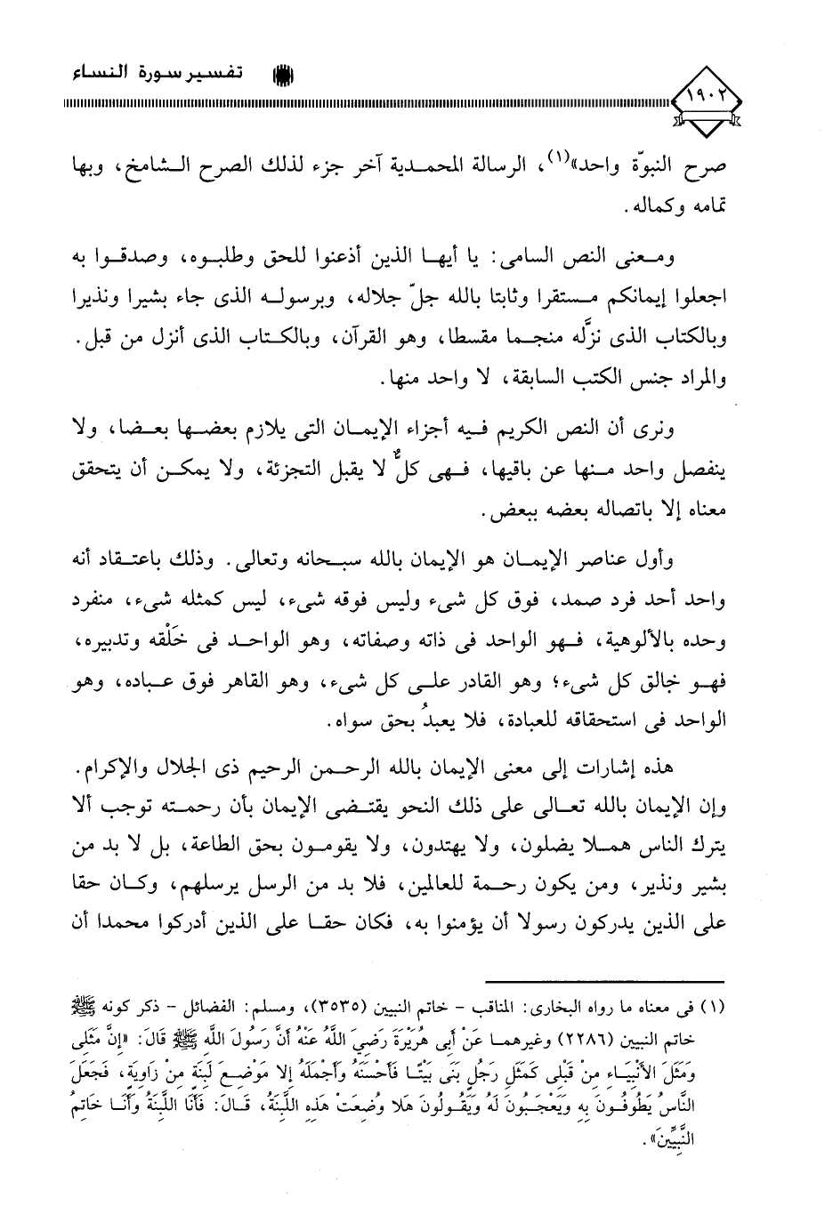 (¬1) في معناه ما رواه البخاري: المناقب - خاتم النبيين (3535)، ومسلم: الفضائل - ذكر كونه - صلى الله عليه وسلم - خاتم النبيين (2286) وغيرهما عَنْ أَبِي هُرَيْرَةَ رَضِيَ اللَّهُ عَنْهُ، أَنَّ رَسُولَ اللَّهِ صَلَّى اللهُ عَلَيْهِ وَسَلَّمَ، قَالَ: إِنَّ " مَثَلِي وَمَثَلَ الأَنْبِيَاءِ مِنْ قَبْلِي، كَمَثَلِ رَجُلٍ بَنَى بَيْتًا فَأَحْسَنَهُ وَأَجْمَلَهُ، إِلَّا مَوْضِعَ لَبِنَةٍ مِنْ زَاوِيَةٍ، فَجَعَلَ النَّاسُ يَطُوفُونَ بِهِ، وَيَعْجَبُونَ لَهُ، وَيَقُولُونَ هَلَّا وُضِعَتْ هَذِهِ اللَّبِنَةُ؟ قَالَ: فَأَنَا اللَّبِنَةُ وَأَنَا خَاتِمُ النَّبِيِّينَ ".