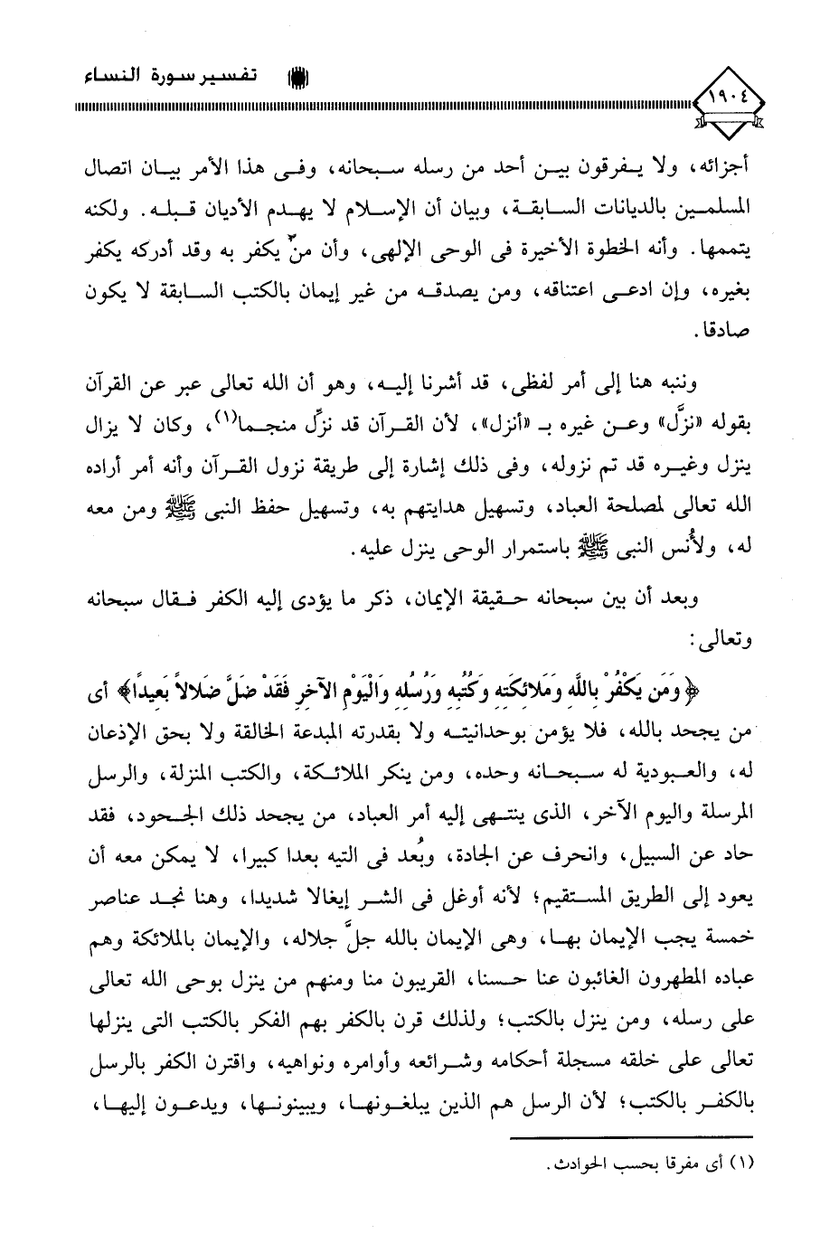 (وَمَنْ يَكْفُرْ بِاللَّهِ وَمَلَائِكَتِهِ وَكُتُبِهِ وَرُسُلِهِ وَالْيَوْمِ الْآخِرِ فَقَدْ ضَلَّ ضَلَالًا بَعِيدًا) أي من يجحد بالله، فلا يؤمن بوحدانيته ولا بقدرته المبدعة الخالقة ولا بحق الإذعان له، والعبودية له سبحانه وحده، ومن ينكر الملائكة، والكتب المنزلة، والرسل المرسلة واليوم الآخر، الذي ينتهي إليه أمر العباد، من يجحد ذلك الجحود، فقد حاد عن السبيل، وانحرف عن الجادة، وبُعد في التيه بعدا كبيرا، لَا يمكن معه أن يعود إلى الطريق المستقيم؛ لأنه أوغل في الشر إيغالا شديدا، وهنا نجد عناصر خمسة يجب الإيمان بها، وهي الإيمان بالله جل جلاله، والإيمان بالملائكة وهم عباده المطهرون الغائبون عنا حسنا، القريبون منا ومنهم من ينزل بوحي الله تعالى على رسله، ومن ينزل بالكتب؛ ولذلك قرن بالكفر بهم الفكر بالكتب التي ينزلها تعالى على خلقه مسجلة أحكامه وشرائعه وأوامره ونواهيه، واقترن الكفر بالرسل بالكفر بالكتب؛ لأن الرسل هم الذين يبلغونها، ويبينونها، ويدعون إليها،