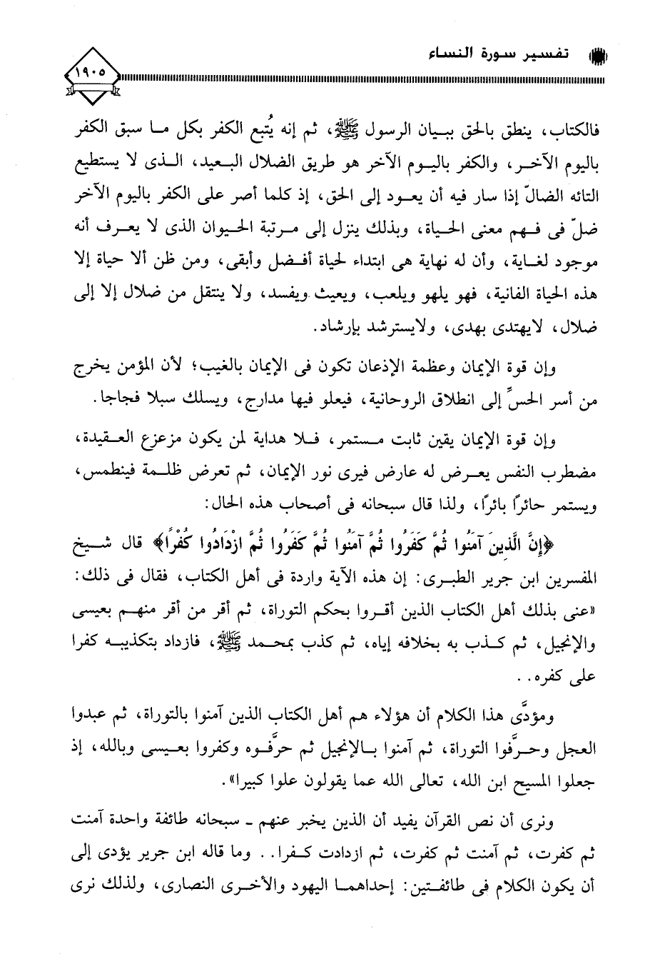ونرى أن نص القرآن يفيد أن الذين يخبر عنهم - سبحانه طائفة واحدة آمنت ثم كفرت، ثم آمنت ثم كفرت، ثم ازدادت كفرا. . وما قاله ابن جرير يؤدي إلى أن يكون الكلام في طائفتين: إحداهما اليهود والأخرى النصارى، ولذلك نرى