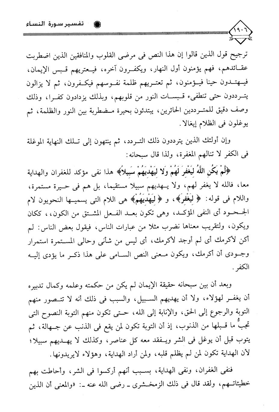 وبعد أن بين سبحانه حقيقة الإيمان لم يكن من حكمته وعلمه وكمال تدبيره أن يغفر لهؤلاء، ولا أن يهديهم السبيل، والسبب في ذلك أنه لَا تتصور منهم التوبة والرجوع إلى الحق، والإنابة إلى الله، حتى تكون منهم التوبة النصوح التي تجبُّ ما قبلها من الذنوب، إذ أن التوبة تكون لمن يقع في الذنب عن جهالة، ثم يتوب قبل أن يوغل في الشر ويفقد معه كل عناصر، وكذلك لَا يهديهم سبيلا؛ لأن الهداية تكون لمن لم يظلم قلبه، ولمن أراد الهداية، وهؤلاء لَا يريدونها.