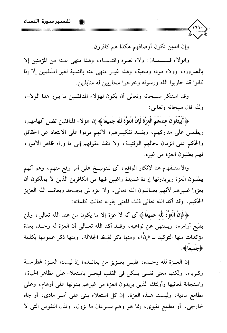(أَيَبْتَغُونَ عِنْدَهُمُ الْعِزَّةَ فَإِنَّ الْعِزَّةَ لِلَّهِ جَمِيعًا) إن هؤلاء المنافقين تضل أفهامهم، ويطمس على مداركهم، ويفسد تفكيرهم؛ لأنهم مردوا على الابتعاد عن الحقائق والحكم على الزمان بحالهم الوقتية، ولا تنفذ عقولهم إلى ما وراء ظاهر الأمور، فهم يطلبون العزة من غيره.