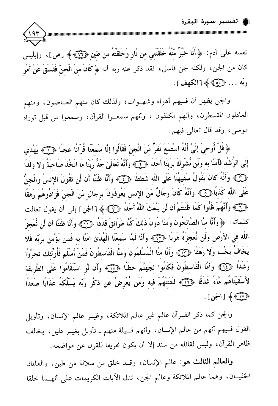 والجن كما ذكر القرآن عالم غير عالم الملائكة، وغير عالم الإنسان، وتأويل القول فيهم أنهم من عالم الإنسان، وأنهم قبيلة منهم - تأويل بغير دليل، يخالف ظاهر القرآن، وليس لقائله من سند إلا أن يكون تحريفا للقول عن مواضعه.