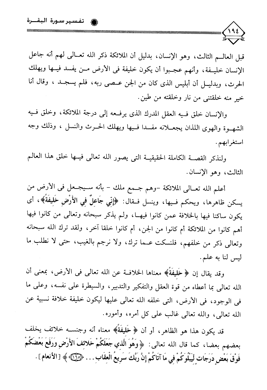 يسكن ظاهرها، ويحكم فيها، وينسل فقال: (إِنِي جَاعِلٌ فِي الأَرْضِ خَلِيفَةً)، أي يكون ساكنا فيها بالخلافة عمن كانوا فيها، ولم يذكر سبحانه وتعالى من كانوا فيها أهم كانوا من الملائكة أم كانوا من الجن، أم كانوا خلقا آخر، ولقد ترك الله سبحانه وتعالى ذكر من خلفهم، فلنسكت عما ترك، ولا نرجم بالغيب، حتى لَا نطلب ما ليس لنا به علم.