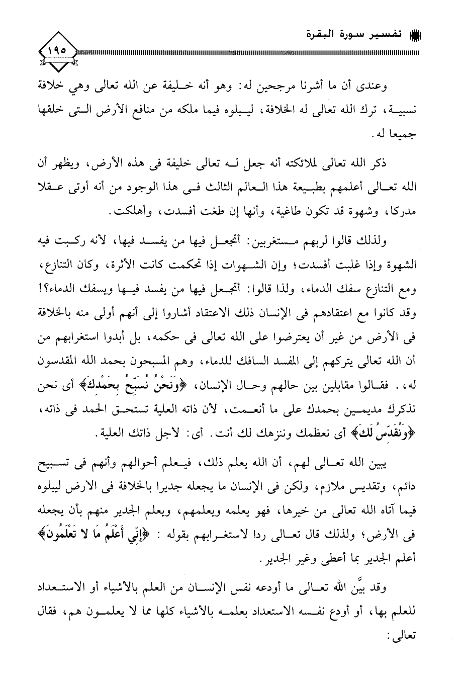 يبين الله تعالى لهم، أن الله يعلم ذلك، فيعلم أحوالهم وأنهم في تسبيح دائم، وتقديس ملازم، ولكن في الإنسان ما يجعله جديرا بالخلافة في الأرض ليبلوه فيما آتاه الله تعالى من خيرها، فهو يعلمه ويعلمهم، ويعلم الجدير منهم بأن يجعله في الأرض، ولذلك قال تعالى ردا لاستغرابهم بقوله: (إِنِّي أَعْلَمُ مَا لَا تَعْلَمونَ) أعلم الجدير بما أعطى وغير الجدير.