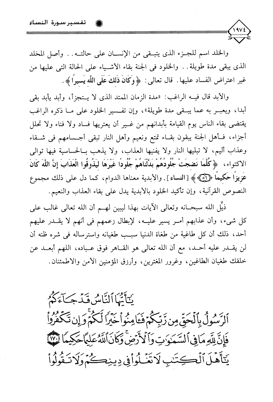 (يَا أَيُّهَا النَّاسُ قَدْ جَاءَكُمُ الرَّسُولُ بِالْحَقِّ مِنْ رَبِّكُمْ فَآمِنُوا خَيْرًا لَكُمْ وَإِنْ تَكْفُرُوا فَإِنَّ لِلَّهِ مَا فِي السَّمَاوَاتِ وَالْأَرْضِ وَكَانَ اللَّهُ عَلِيمًا حَكِيمًا (170) يَا أَهْلَ الْكِتَابِ لَا تَغْلُوا فِي دِينِكُمْ وَلَا تَقُولُوا