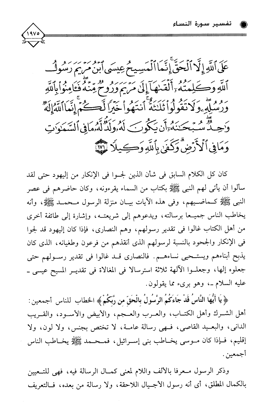 عَلَى اللَّهِ إِلَّا الْحَقَّ إِنَّمَا الْمَسِيحُ عِيسَى ابْنُ مَرْيَمَ رَسُولُ اللَّهِ وَكَلِمَتُهُ أَلْقَاهَا إِلَى مَرْيَمَ وَرُوحٌ مِنْهُ فَآمِنُوا بِاللَّهِ وَرُسُلِهِ وَلَا تَقُولُوا ثَلَاثَةٌ انْتَهُوا خَيْرًا لَكُمْ إِنَّمَا اللَّهُ إِلَهٌ وَاحِدٌ سُبْحَانَهُ أَنْ يَكُونَ لَهُ وَلَدٌ لَهُ مَا فِي السَّمَاوَاتِ وَمَا فِي الْأَرْضِ وَكَفَى بِاللَّهِ وَكِيلًا (171)