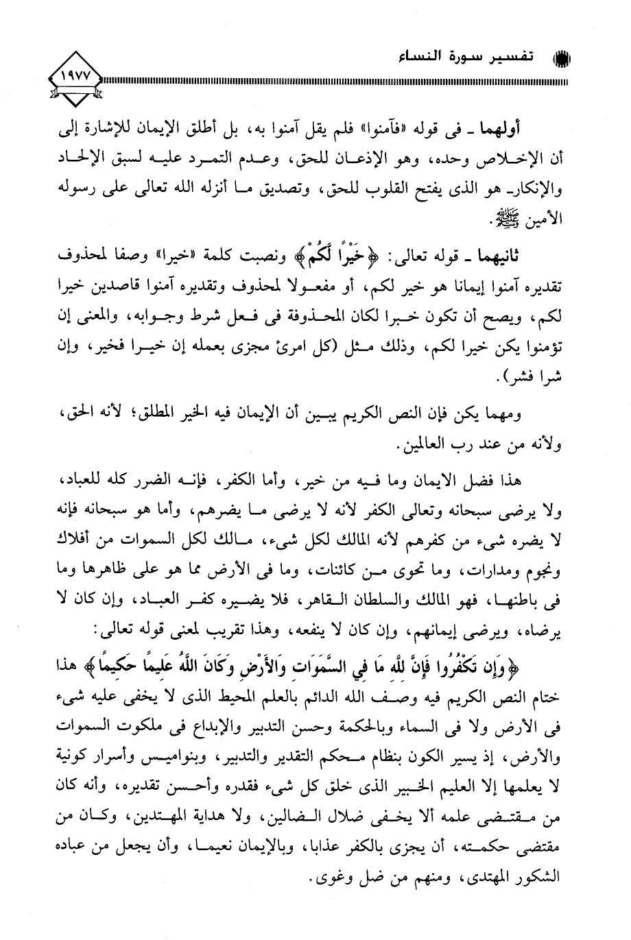هذا فضل الايمان وما فيه من خير، وأما الكفر، فإنه الضرر كله للعباد، ولا يرضى سبحانه وتعالى الكفر لأنه لَا يرضى ما يضرهم، وأما هو سبحانه فإنه لا يضره شيء من كفرهم لأنه المالك لكل شيء، مالك لكل السماوات من أفلاك ونجوم ومدارات، وما تحوي من كائنات، وما في الأرض مما هو على ظاهرها وما في باطنها، فهو المالك والسلطان القاهر، فلا يضيره كفر العباد، وإن كان لا يرضاه، ويرضى إيمانهم، وإن كان لَا ينفعه، وهذا تقريب لمعنى قوله تعالى: (وَإِن تَكْفُروا فَإِنَّ لِلَّهِ مَا فِي السَّمَاوَاتِ وَالأَرْضِ وَكَانَ اللَّهُ عَلِيمًا حَكِيمًا) هذا ختام النص الكريم فيه وصف الله الدائم بالعلم المحيط الذي لَا يخفى عليه شيء في الأرض ولا في السماء وبالحكمة وحسن التدبير والإبداع في ملكوت السماوات والأرض، إذ يسير الكون بنظام محكم التقدير والتدبير، وبنواميس وأسرار كونية لا يعلمها إلا العليم الخبير الذي خلق كل شيء فقدره وأحسن تقديره، وأنه كان من مقتضى علمه ألا يخفى ضلال الضالين، ولا هداية المهتدين، وكان من مقتضى حكمته، أن يجزي بالكفر عذابا، وبالإيمان نعيما، وأن يجعل من عباده الشكور المهتدي، ومنهم من ضل وغوى.