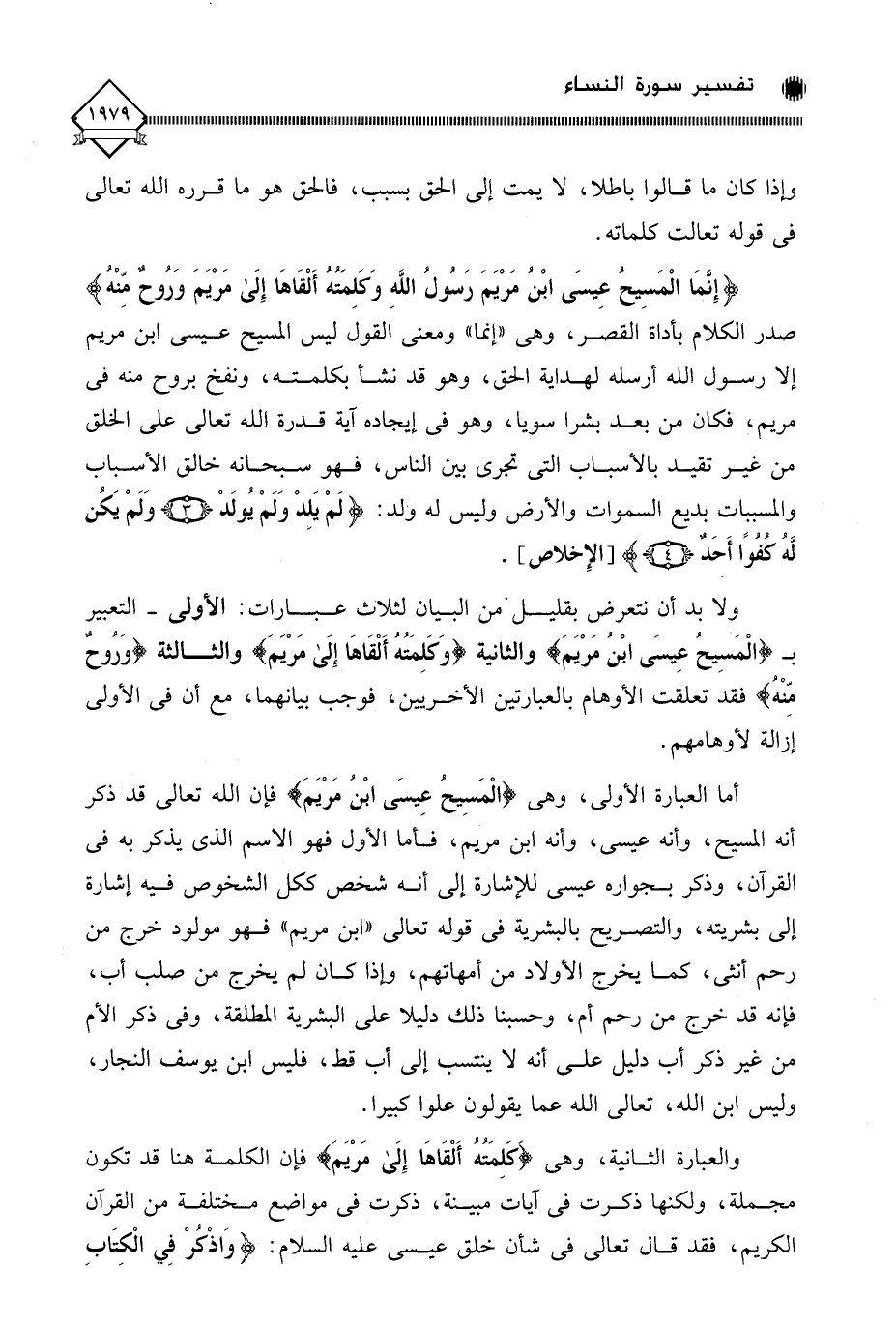 ولا بد أن نتعرض بقليل من البيان لثلاث عبارات: الأولى - التعبير بـ (الْمَسِيحُ عِيسَى ابْنُ مرْيَمَ) والثانية (وَكَلِمَتُهُ أَلْقَاهَا إِلَى مَرْيَمَ) والثالثة (وَرُوح مِّنْهُ) فقد تعلقت الأوهام بالعبارتين الأخريين، فوجب بيانهما، مع أن في الأولى إزالة الأوهامهم.